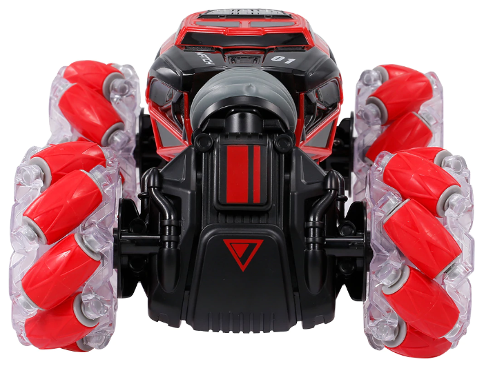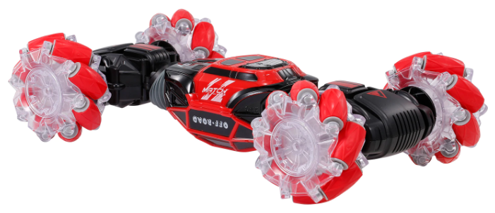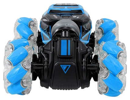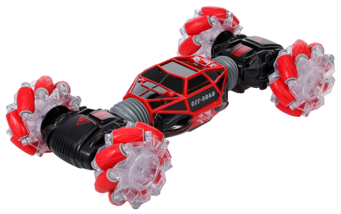 - Машинка оснащена четырьмя отдельными моторами (по одному на каждое колесо), что обеспечивает полный привод и возможность движения боком, вращения на месте, преодоления препятствий.