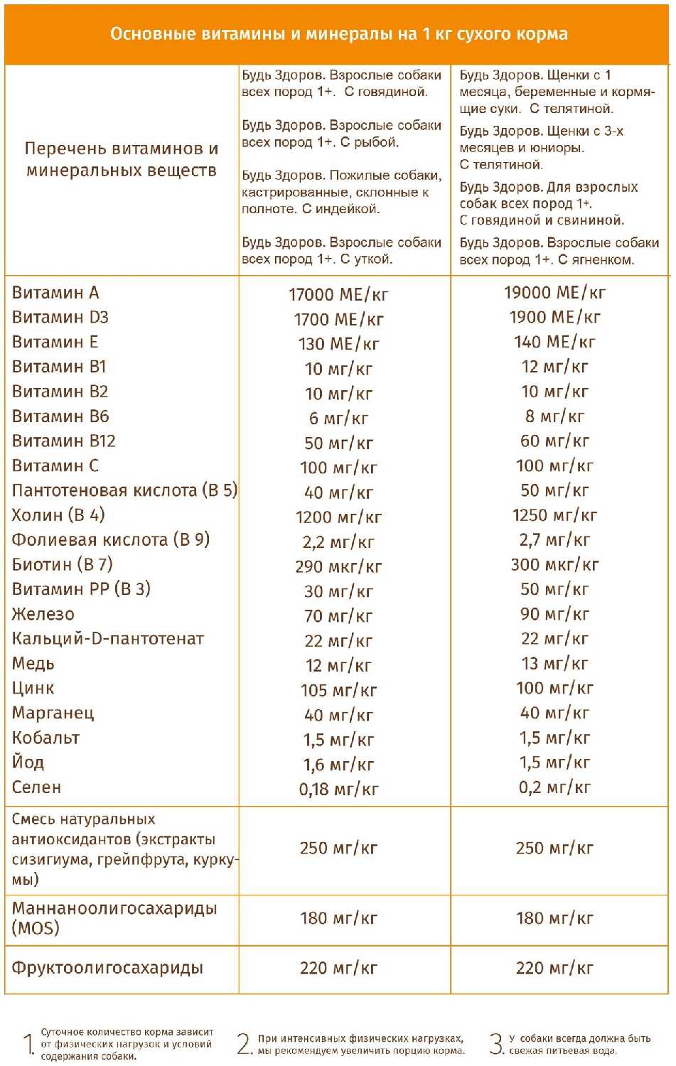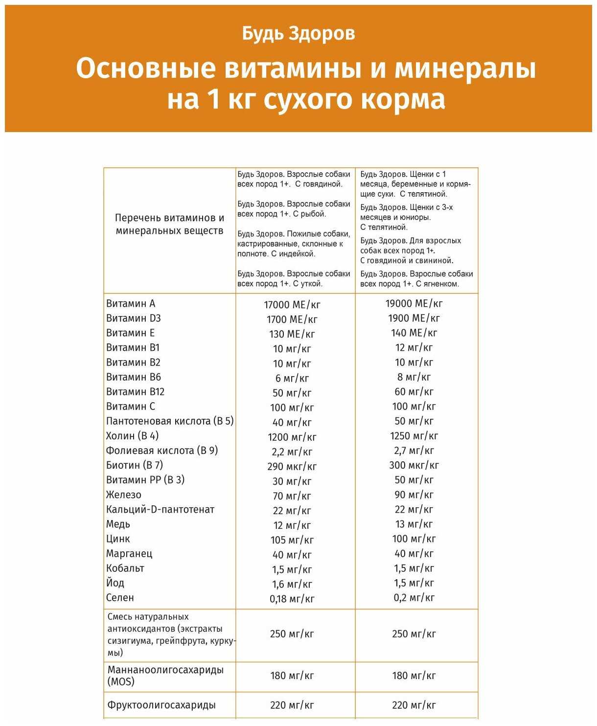 | Витамины : | A, D3, E, B1, B2, B6, B12, C, РР, пантотеновая кислота, фолиевая кислота |