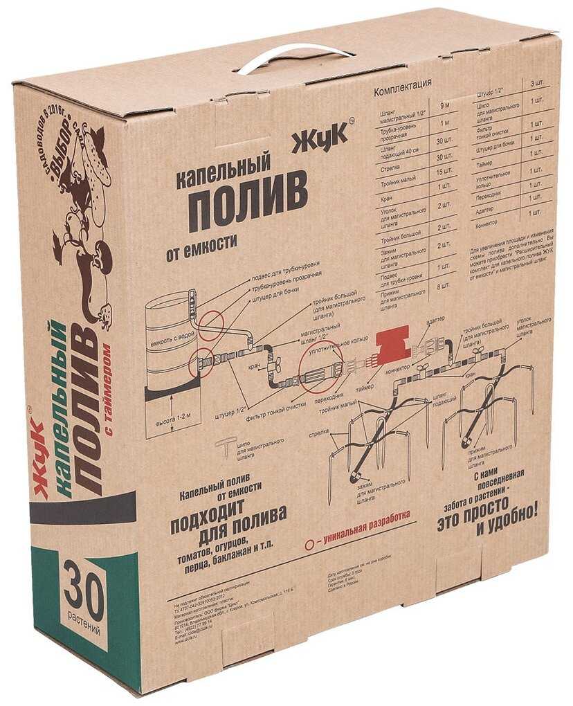 | Дополнительная информация : | Прикорневой капельный полив Жук от ёмкости с таймером полностью готов к работе. Используется в парниках и теплицах, а также на открытом грунте. Имеет электронный таймер, с помощью которого можно настраивать продолжительность и интервалы между поливами. |