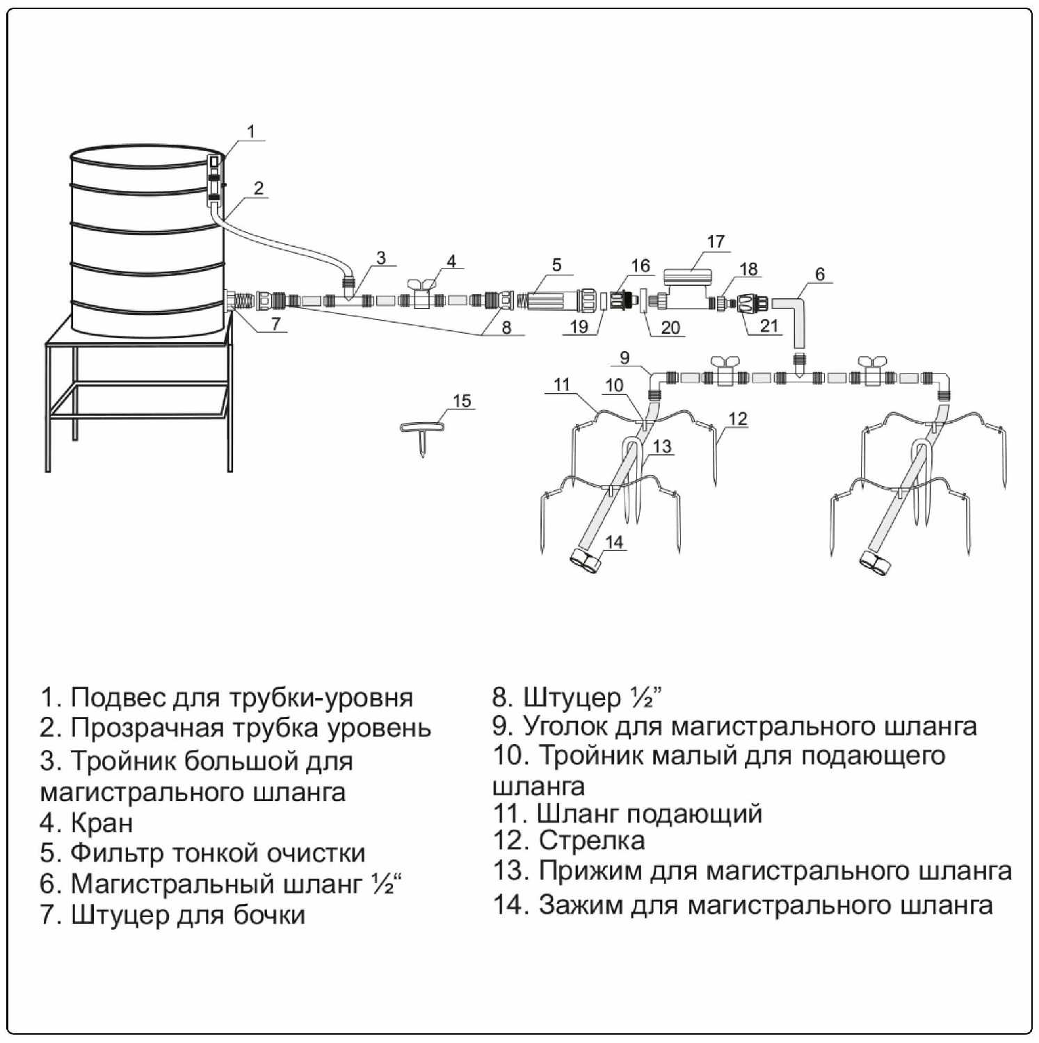 | Комплектация : | электронный таймер - 1 шт., шланг магистральный 9 м., шланг подающий 40см - 30 шт., капельницы - 30 шт., штуцер присоединения к ёмкости - 1 шт., трубка уровень прозрачная 1 м. - 1 шт., подвес для трубки уровня -1 шт., тройник малый - 15 шт., кран - 1 шт., уголок для магистрального шланга - 2 шт., тройник большой - 2 шт., заглушка для магистрального шланга - 2 шт., прижим для магистрального шланга -18 шт., шило для магистрального шланга - 1 шт., штуцер 1/2" ( для соединения с ёмкостью) - 1 шт., штуцер 3/4(для монтажа фильтра) - 2 шт., фильтр тонкой очистки - 1 шт., инструкция по монтажу. |