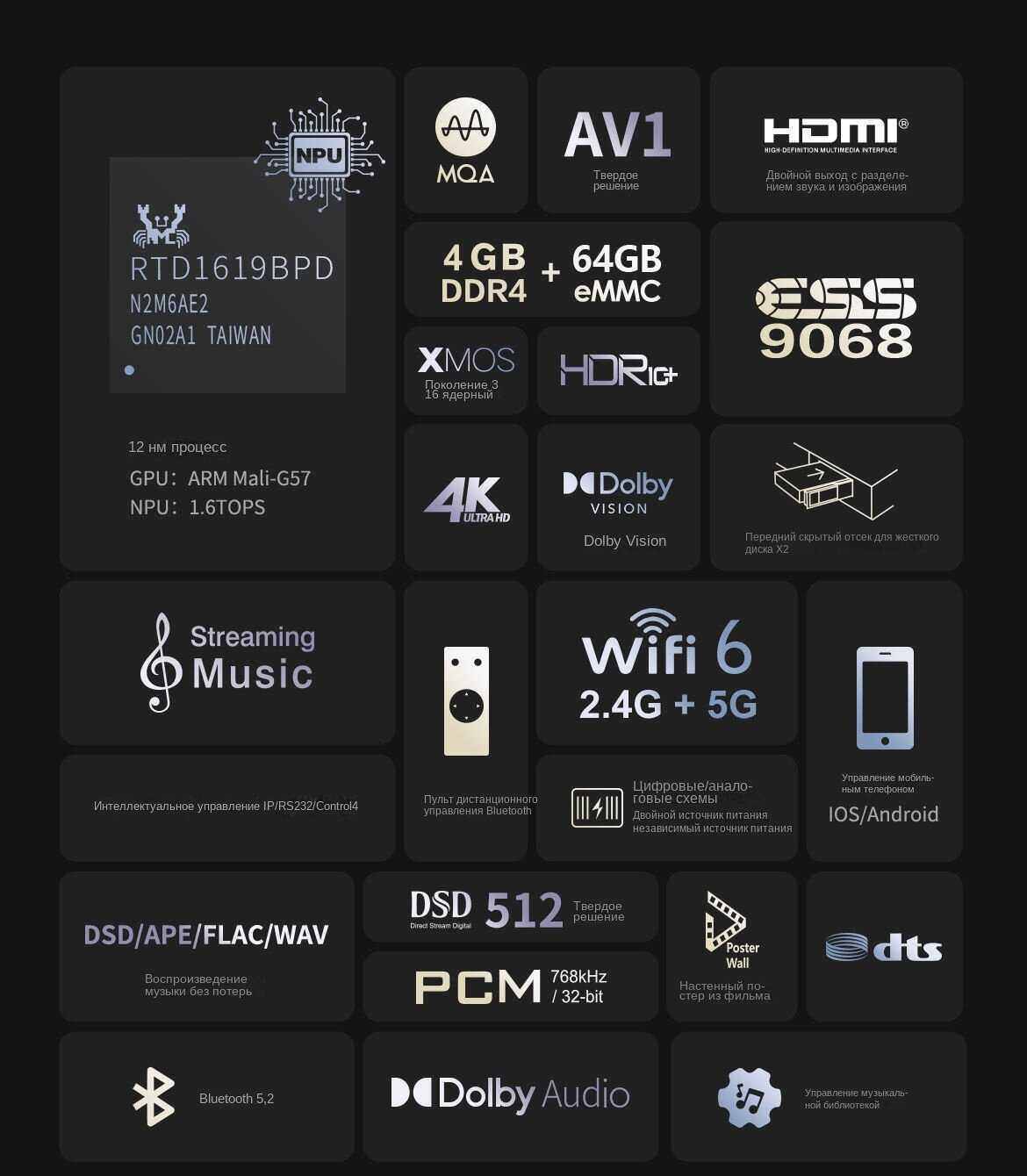 | Поддерживаемые форматы музыки : | AAC, AC3, ALAC, APE, FLAC, MP3, WAV |