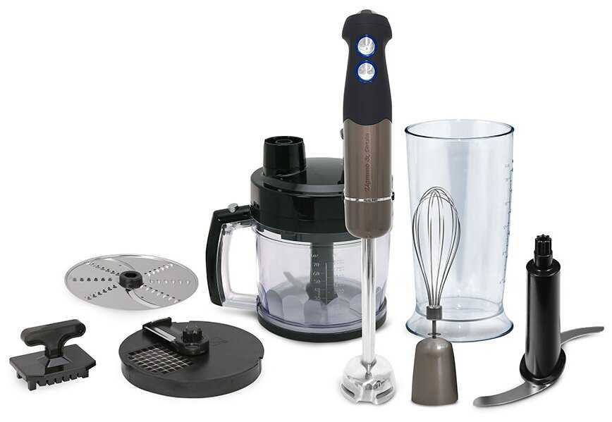 - Набор включает насадки для нарезки кубиками, терки, шинковки и погружной блендер, заменяя несколько кухонных приборов.