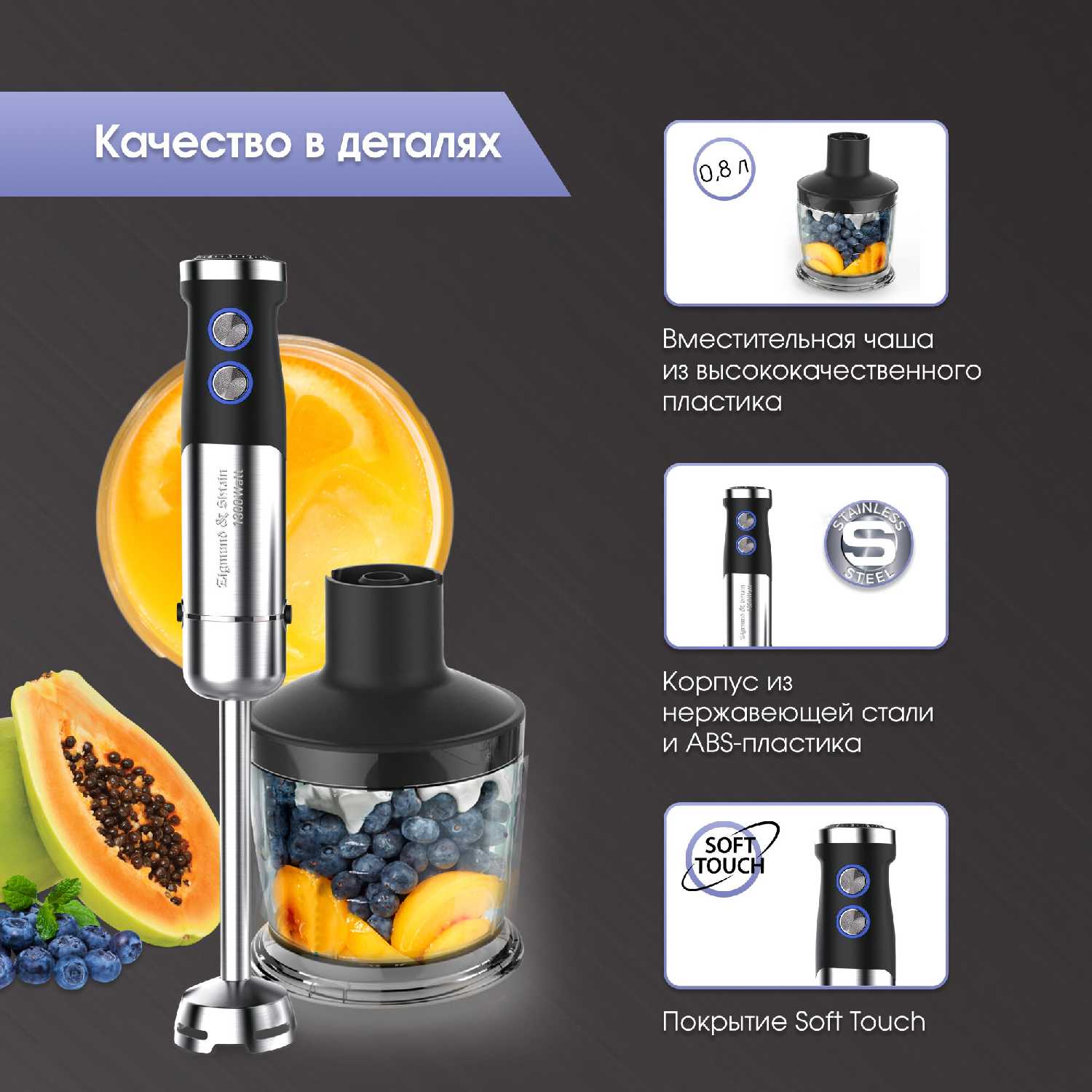 Дополнительная информация : | Комплектация: блок электродвигателя, насадка-блендер из нержавеющей стали, насадка-венчик, насадка-капучинатор, держатель насадки-венчика, нож-измельчитель, чаша измельчителя (800 мл), стакан для смешивания (600 мл), инструкция, гарантийный талон |