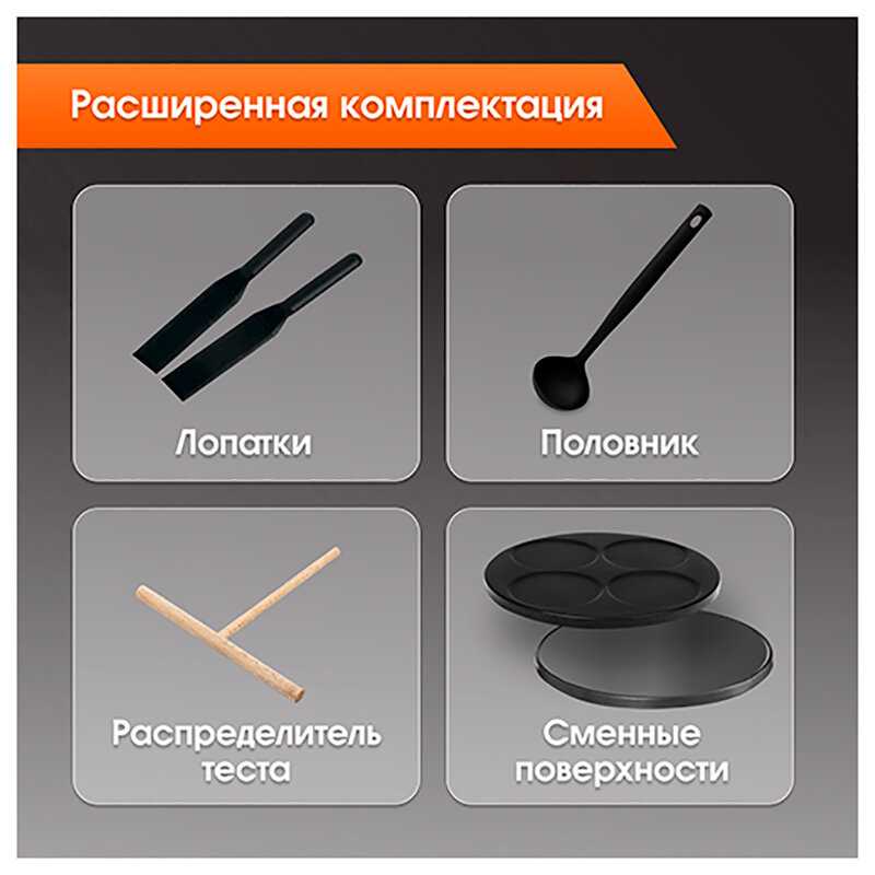 - + Удобно мыть рабочие поверхности, т.к. они съемные. Возможность выпекать как маленькие, так и большие блины. В комплектации есть всё нужное, лопатки, половник и даже распределитель теста. К тому же их можно хранить в самой блиннице. 4 режима работы, можно выбрать оптимальную температуру.