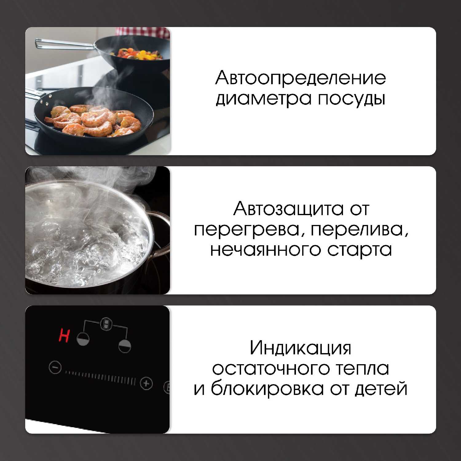 - Безопасность: защитное отключение конфорок