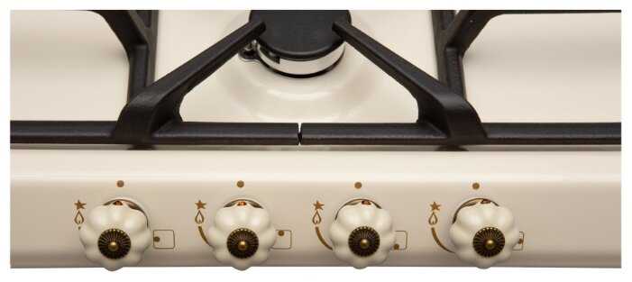 Красивая панель. Отлично нам подошла по дизайну на кухню в ретро стиле. Цвет бежевый, она эмалированная. Можно пользоваться любой химией при мытье. Конфорок четыре, они все разного диаметра и мощности и отлично подходят для любых блюд. Зажигаются при помощи электроподжига, была приятно удивлена, что поджиг не сломался через пару месяцев, как это обычно и происходит. Газ контроль есть, работает, проверяла, учитывая, что у меня двое маленьких детей, это очень важно.