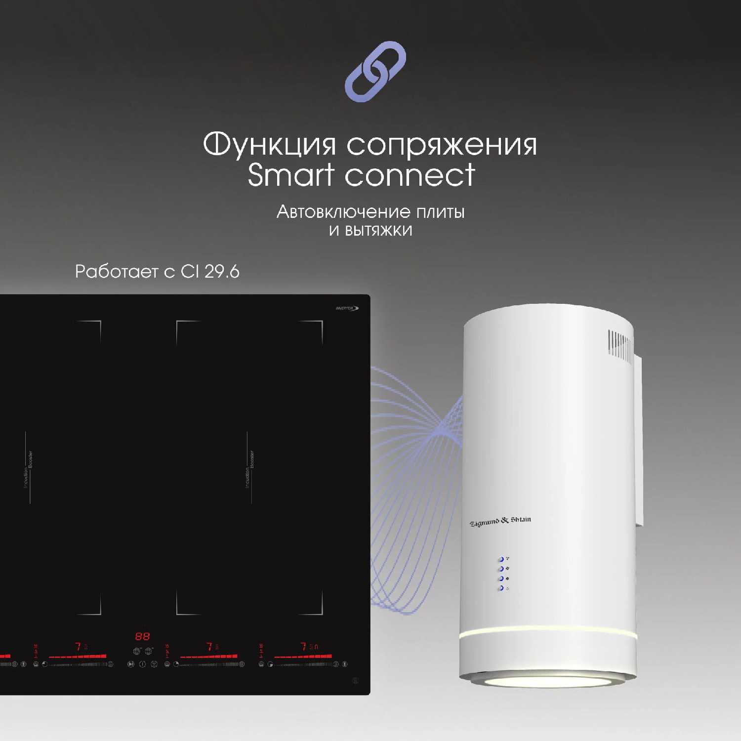 | Дополнительная информация : | Функция сопряжения Smart connect (при включении варочной панели автоматически включается и вытяжка, регулируя скорость работы в зависимости от интенсивности нагрева). Совместима с инверторной индукционной варочной поверхностью CI 29.6 |