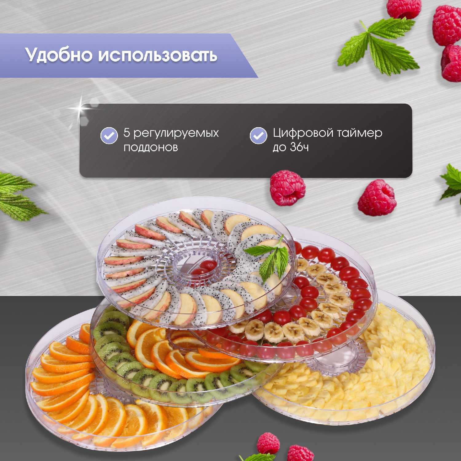 Довольна покупкой. Считала, что подобный агрегат будет занимать много места. Очень комфортно вписалась на полку, рабочая поверхность даже одного яруса вполне просторная. Прозрачный купол дает возможность следить за процессов сушки не открывая сушилку. При желании (если маленькая порция фруктов) можно лишние ярусы убрать