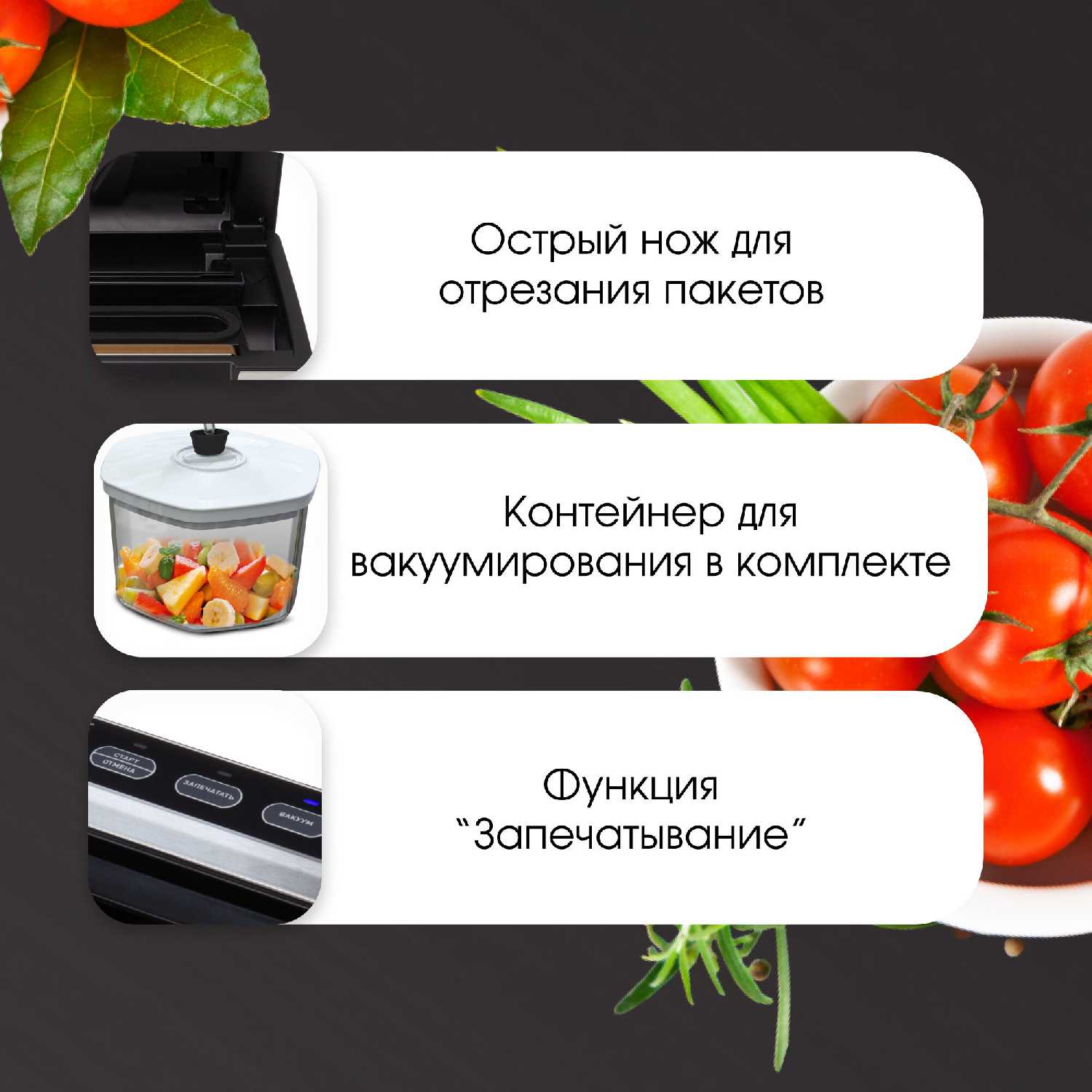 Подробная комплектация : | вакуумный упаковщик, рулон для вакуумной упаковки, контейнер для вакуумирования, вакуумный шланг, гарантийный талон, инструкция |