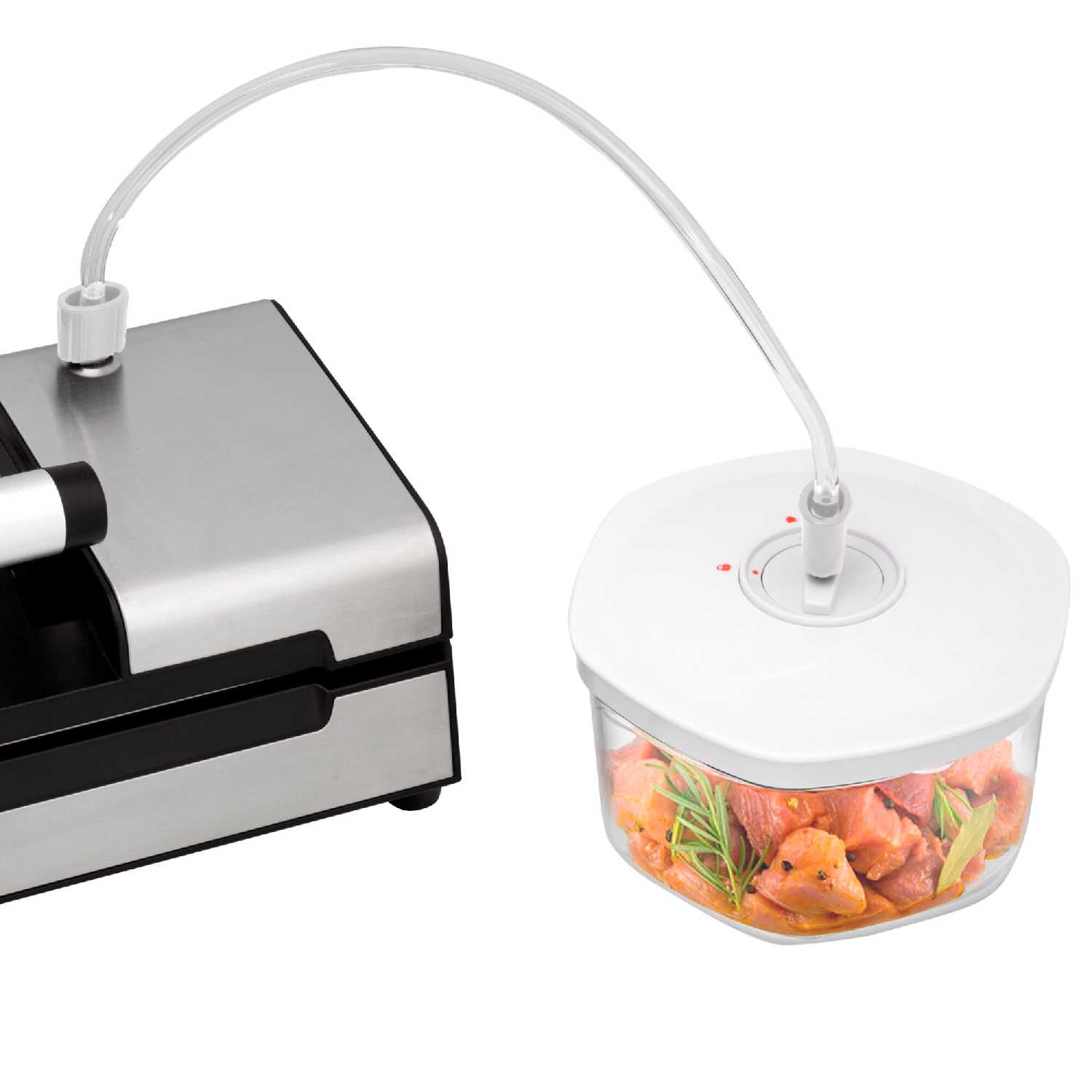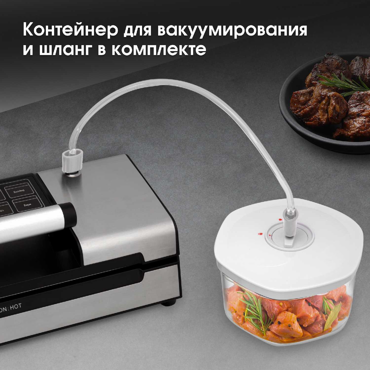 - Возможность вакуумировать не только в пакетах, но и в специальных контейнерах с помощью комплектного шланга (в комплекте идет контейнер 0.7 л).