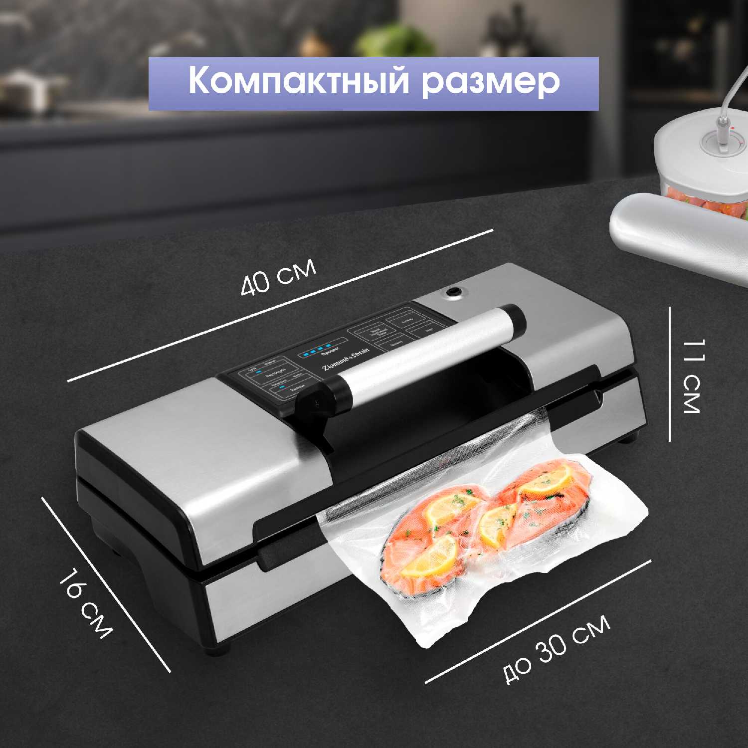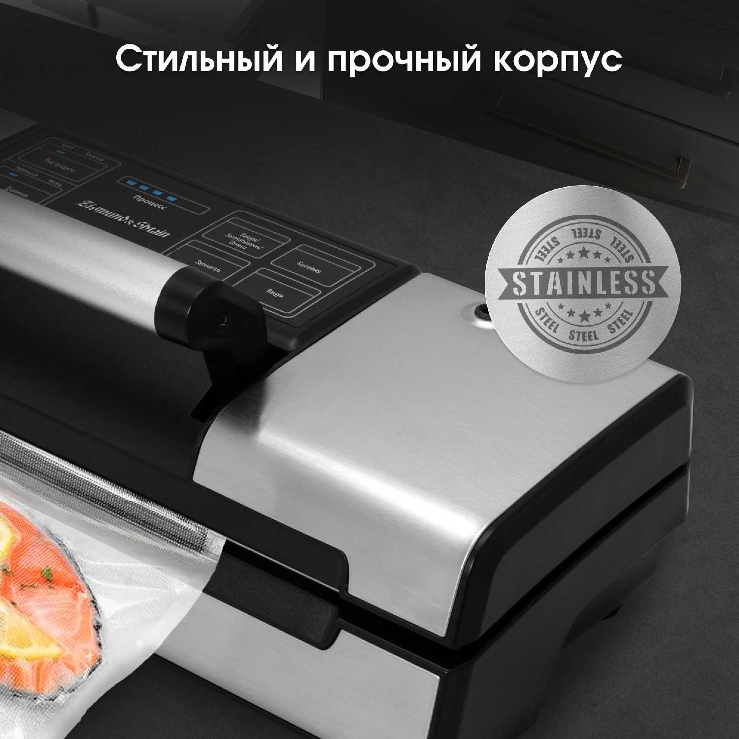 Удобство эксплуатации и эргономика: Эргономика устройства получила высочайшие оценки. Пользователи особенно ценят возможность открывать и закрывать крышку одной рукой, используя удобную ручку, что позволяет второй рукой придерживать пакет – это резко контрастирует с неудобными механизмами закрытия на других моделях. Интеграция всех необходимых аксессуаров в корпус – отсек для рулона пленки, встроенный резак для нее и место для хранения шланга – делает использование очень удобным и избавляет от потерь комплектующих. Убирающийся в корпус сетевой шнур также отмечен как полезная деталь для хранения. Меню управления с кнопками на русском языке и подробная русскоязычная инструкция с рецептами делают освоение прибора легким даже для новичков.