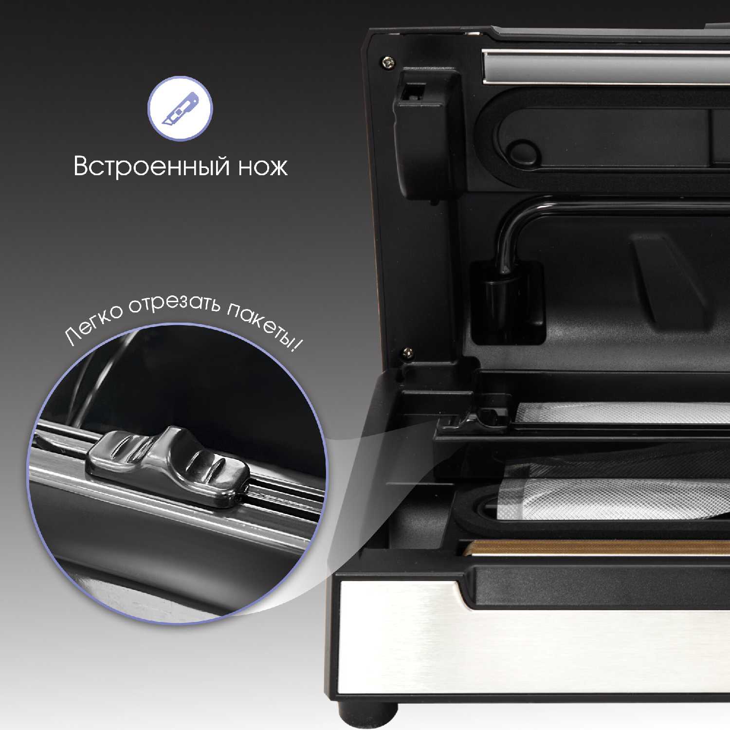 Удобство использования — одна из сильнейших сторон данной модели. Крышка открывается и закрывается одной рукой благодаря продуманной ручке-защелке, что позволяет второй рукой придерживать пакет. В корпусе интегрирован отсек для рулона пакетов со встроенным резаком, а сетевой шнур убирается в специальную нишу, что обеспечивает аккуратное хранение. -