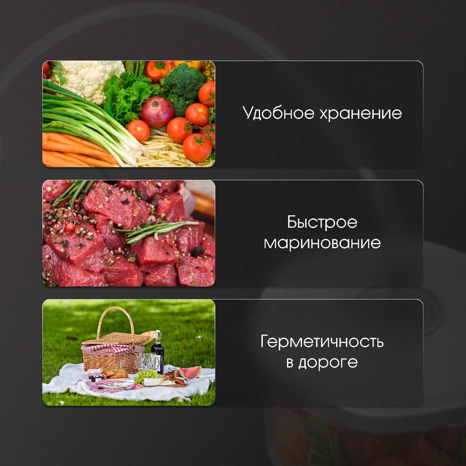 Функциональность и универсальность применения: Ключевым преимуществом, многократно упомянутым в отзывах, является расширенная функциональность, недоступная в бюджетных аналогах. Наличие встроенного шланга (с местом хранения внутри корпуса) для вакуумирования специальных контейнеров (один объемом 0,7 л идет в комплекте) значительно расширяет сферу применения устройства. Пользователи успешно используют эту функцию для вакуумного маринования мяса (что ускоряет процесс в разы), завяливания фруктов (например, яблок) и хранения продуктов. Аппарат поддерживает несколько режимов работы: автоматический, ручной (особенно ценный для деликатных продуктов вроде ягод), и уникальный режим маринования с попеременной откачкой и нагнетанием воздуха. Эта функциональность напрямую связана с возможностью приготовления блюд методом су-вид (sous-vide), что подробно описано в прилагаемой книге рецептов, которую пользователи хвалят за понятность и полезность.