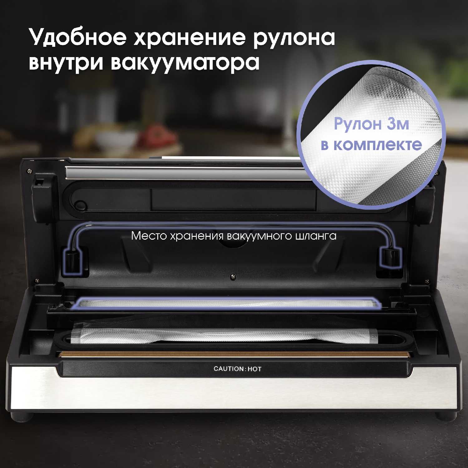 Система хранения продумана brilliantly: шланг, рулон пакетов и резак интегрированы в корпус прибора. Это позволяет всем необходимым аксессуарам всегда быть под рукой и не теряться, обеспечивая максимальное удобство и порядок на кухне. Сетевой шнур также убирается в корпус. -