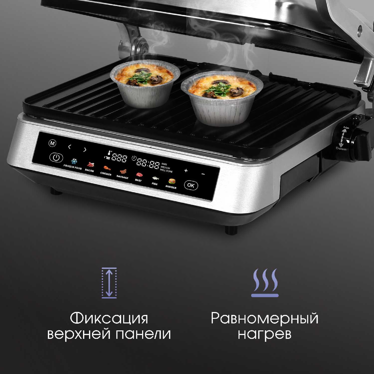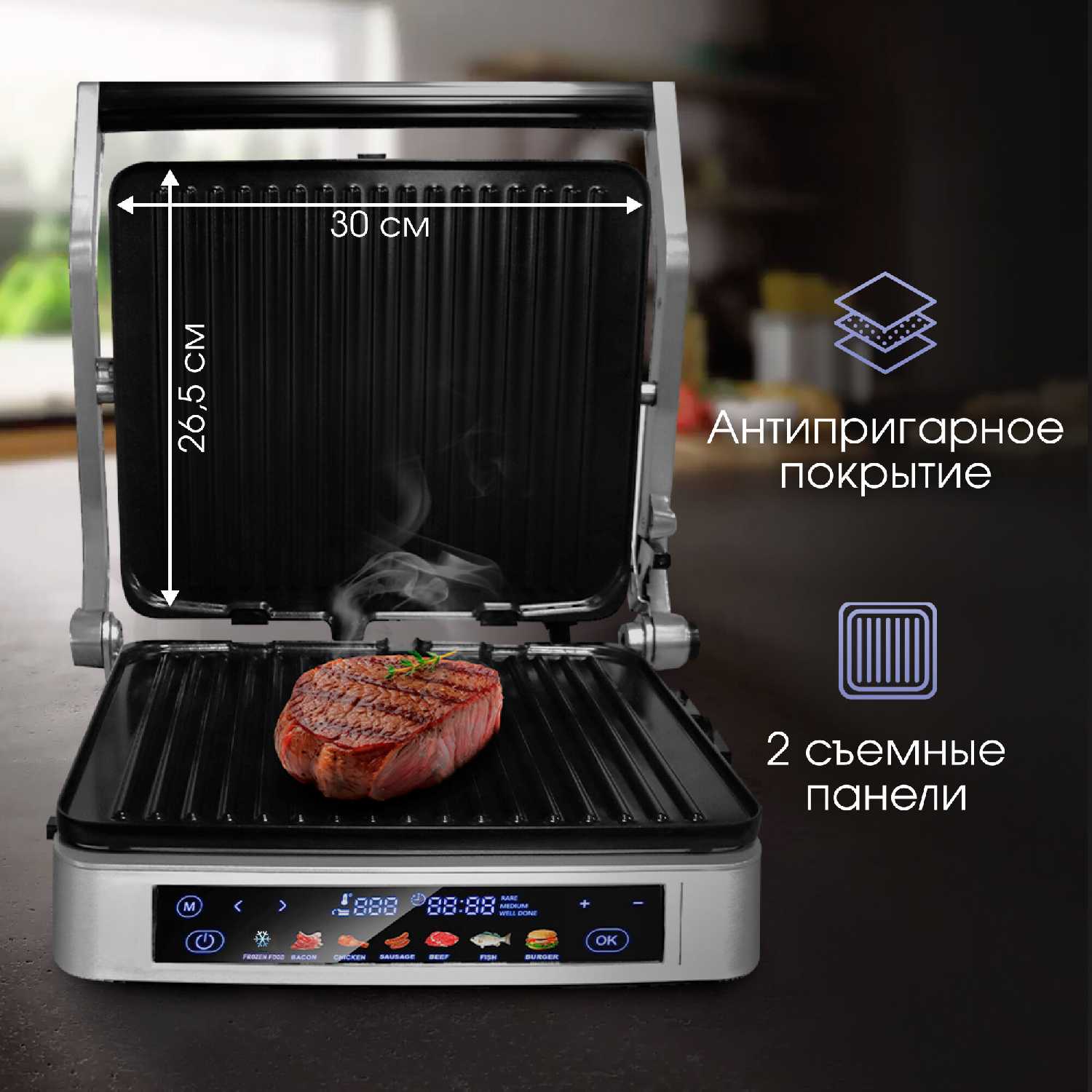 | Особенности : | антипригарное покрытие, поддон для сбора жира, регулировка высоты верхней панели, съемные пластины |