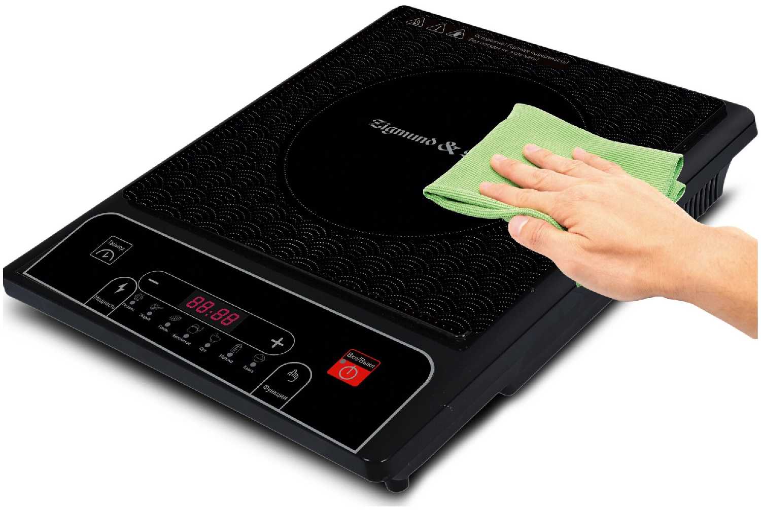 - Гладкая керамическая панель очищается влажной тканью без абразивов после остывания.