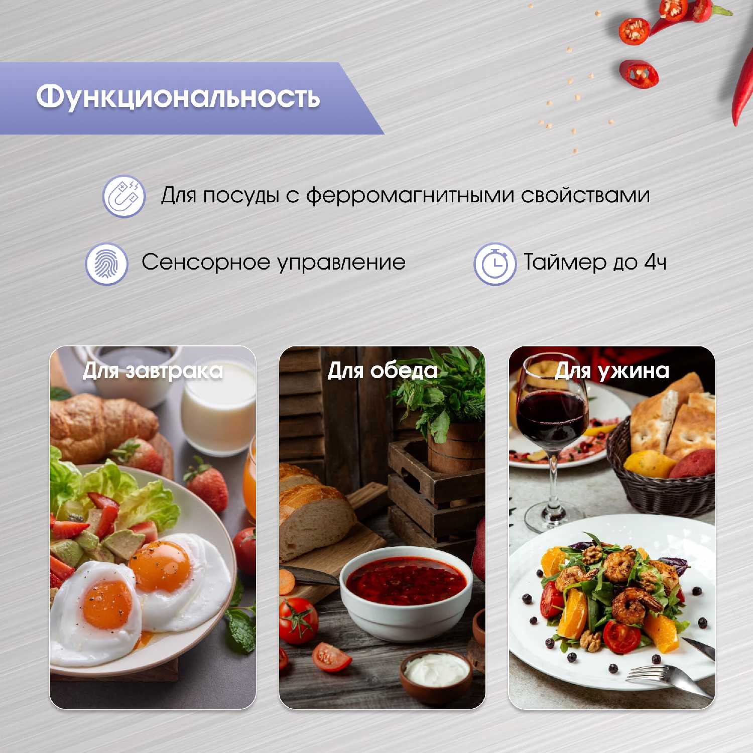 - Локальный нагрев только в зоне посуды (благодаря инфракрасным элементам) минимизирует теплопотери.
