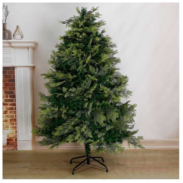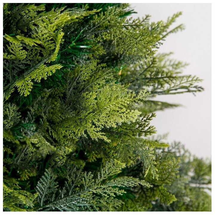 Ооочень пышная и красивая. Смотрится шикарно и такой точно не будет в каждом доме. Частично веточки пластиковые и они похожи на кипарис или тую. В комплекте с пушистыми смотряться отлично. Высота огромная. Елка получается практически под потолок и в диаметре хорошая. От игрушек не кренится, собирать ее было легко. Осталось только придумать чем бы задекорировать металлическую подставку.