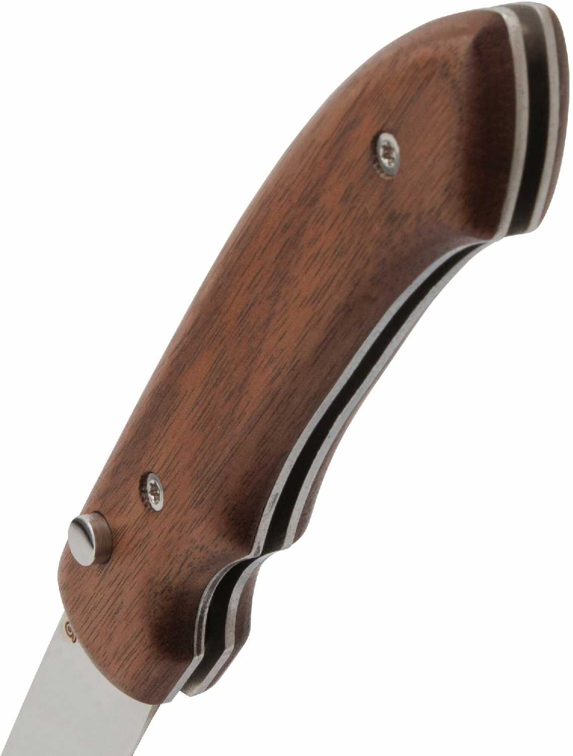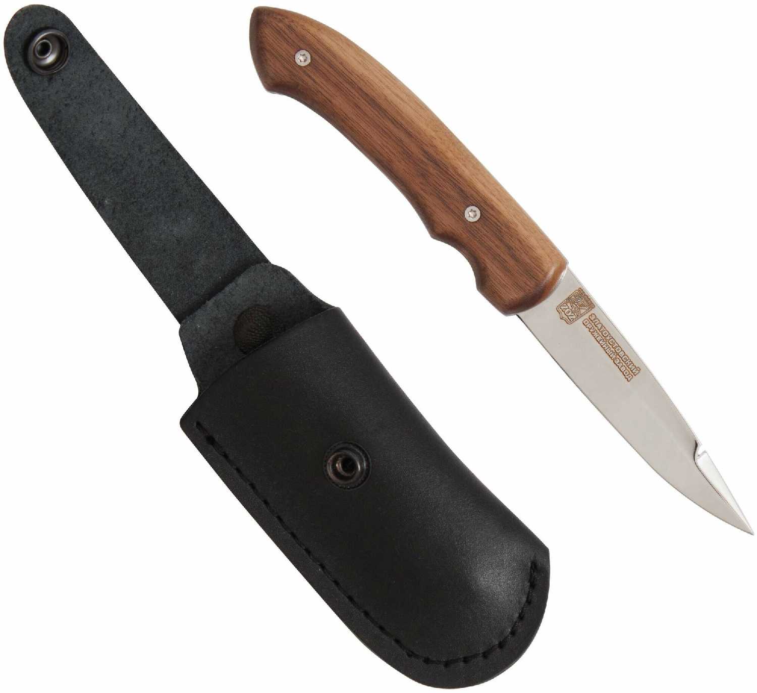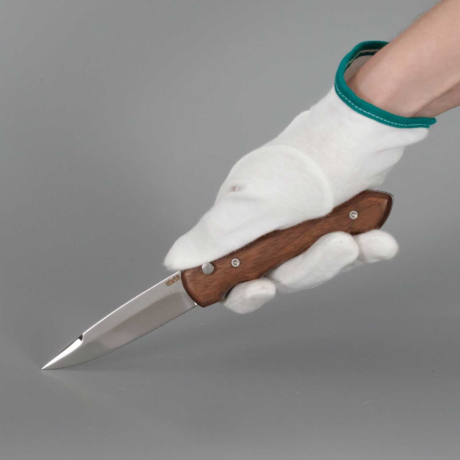- + Очень качественно сделан. Рукоятка орех. Пружина сильная, при любом положении ножа четко открывается и фиксируется. Клинок отполирован, маркировка 95х18. Чехол мягкий, по размеру. Сертификат и результаты испытания прилагаются в небольшом пакетике. Упаковка заводская фирменная. Нож дорогой но он стоит того. Спасибо изготовителям!