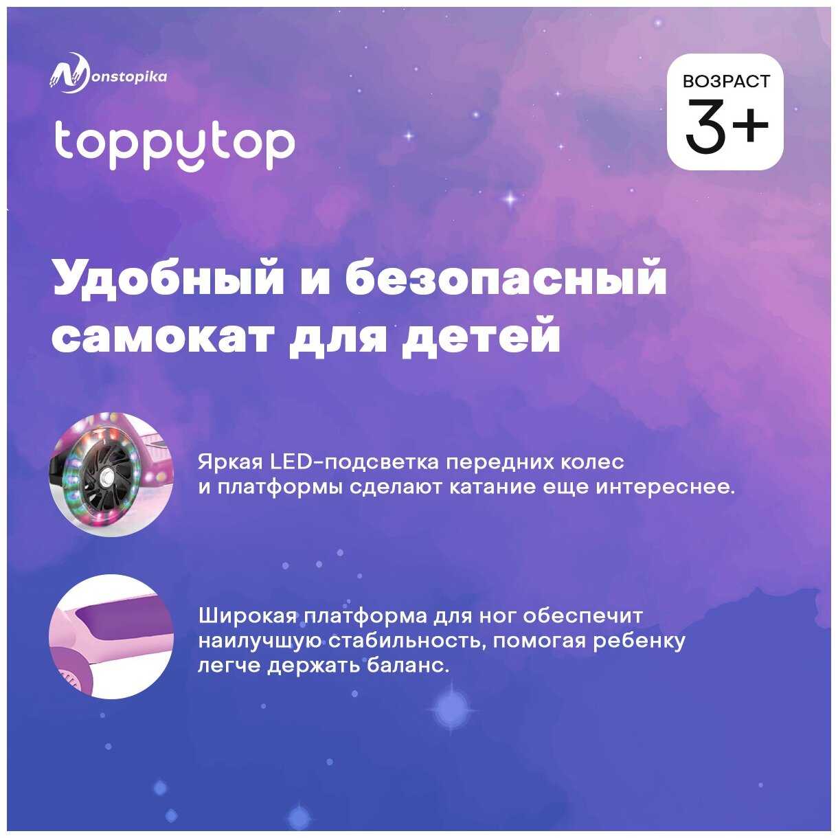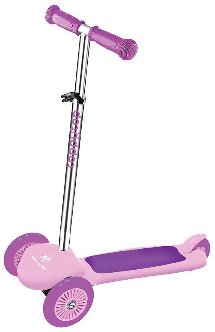 Самокат хороший, собирается, разбирается легко. Руль регулируется по высоте. Колёсики светятся (нужно 3 пальчиковые батарейки). Колеса не маленькие, прорезиненные...