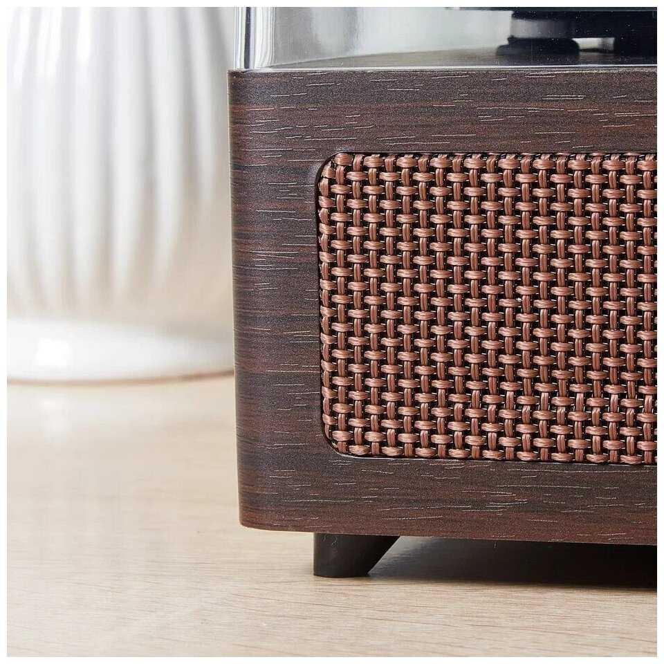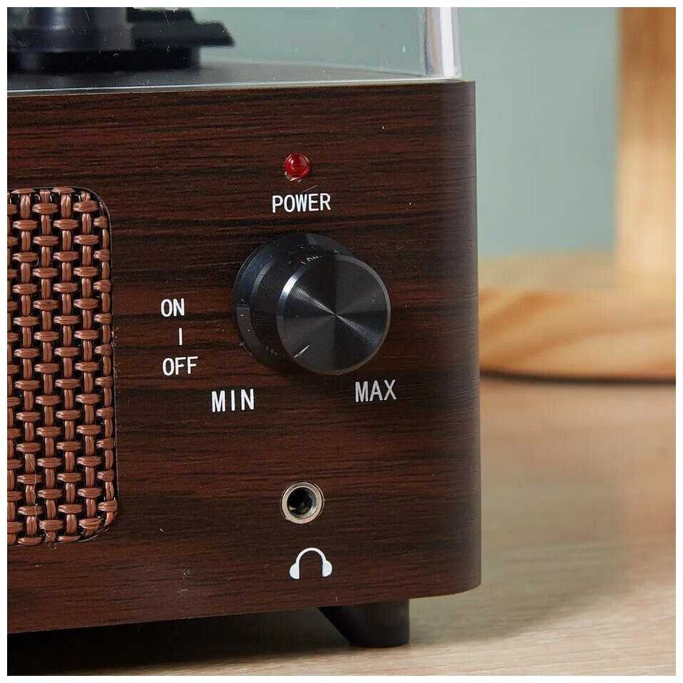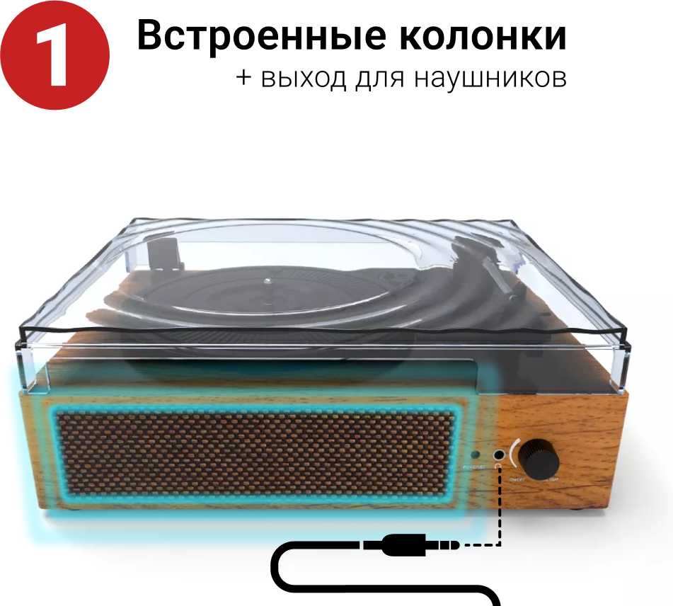 - + Очень довольны приобретением , звук отличный , очень компактное устройство , не занимает много места , можно использовать как колонку, слушать отдельно через наушники музыку . Благодаря звучанию старых пластинок создается романтическое настроение )