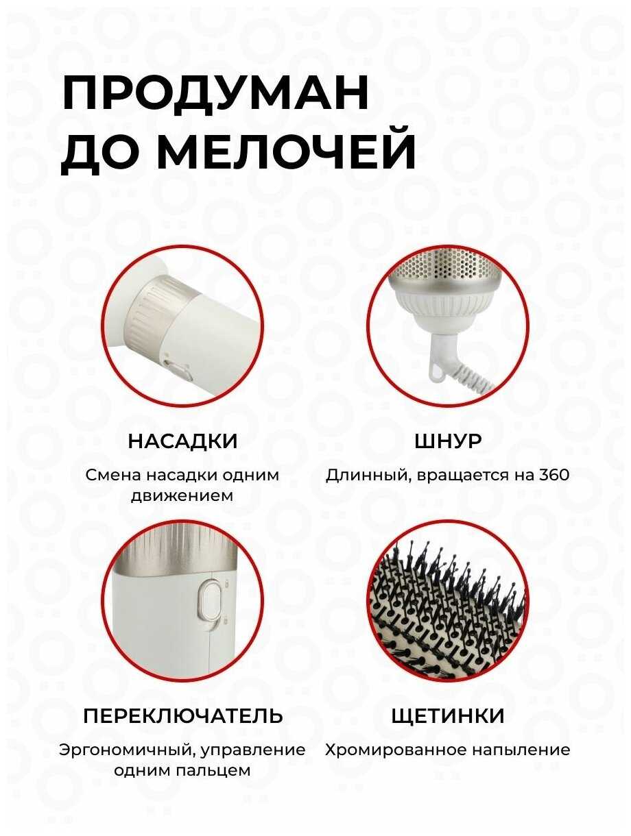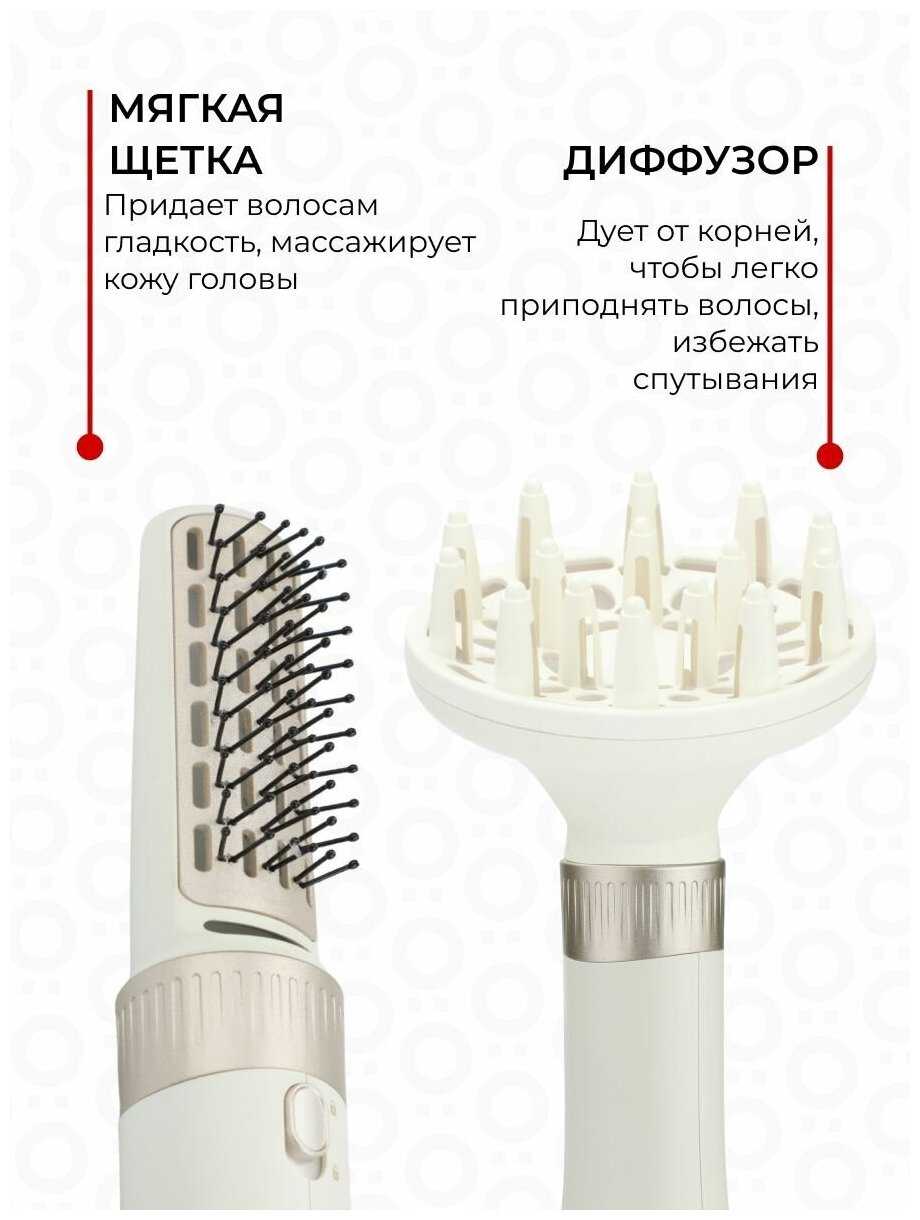 В базовую комплектацию входит 6 насадок: овальный брашинг для выпрямления, круглая щётка для локонов, диффузор для кудрявых волос, а также узкие и широкие концентрирующие насадки. Это позволяет создавать любые укладки — от гладких прядей до пляжных волн. Важно: в редких случаях возможен некомплект при доставке. -