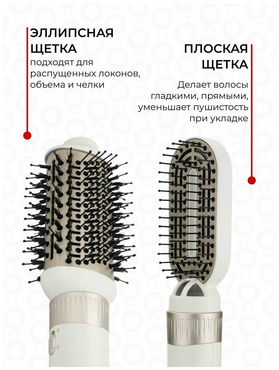 - В комплекте: круглая щетка для объема у корней, плоская для выпрямления, диффузор для кудрей, брашинг с комбинированными щетинками.