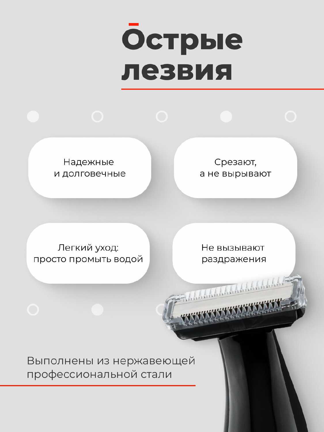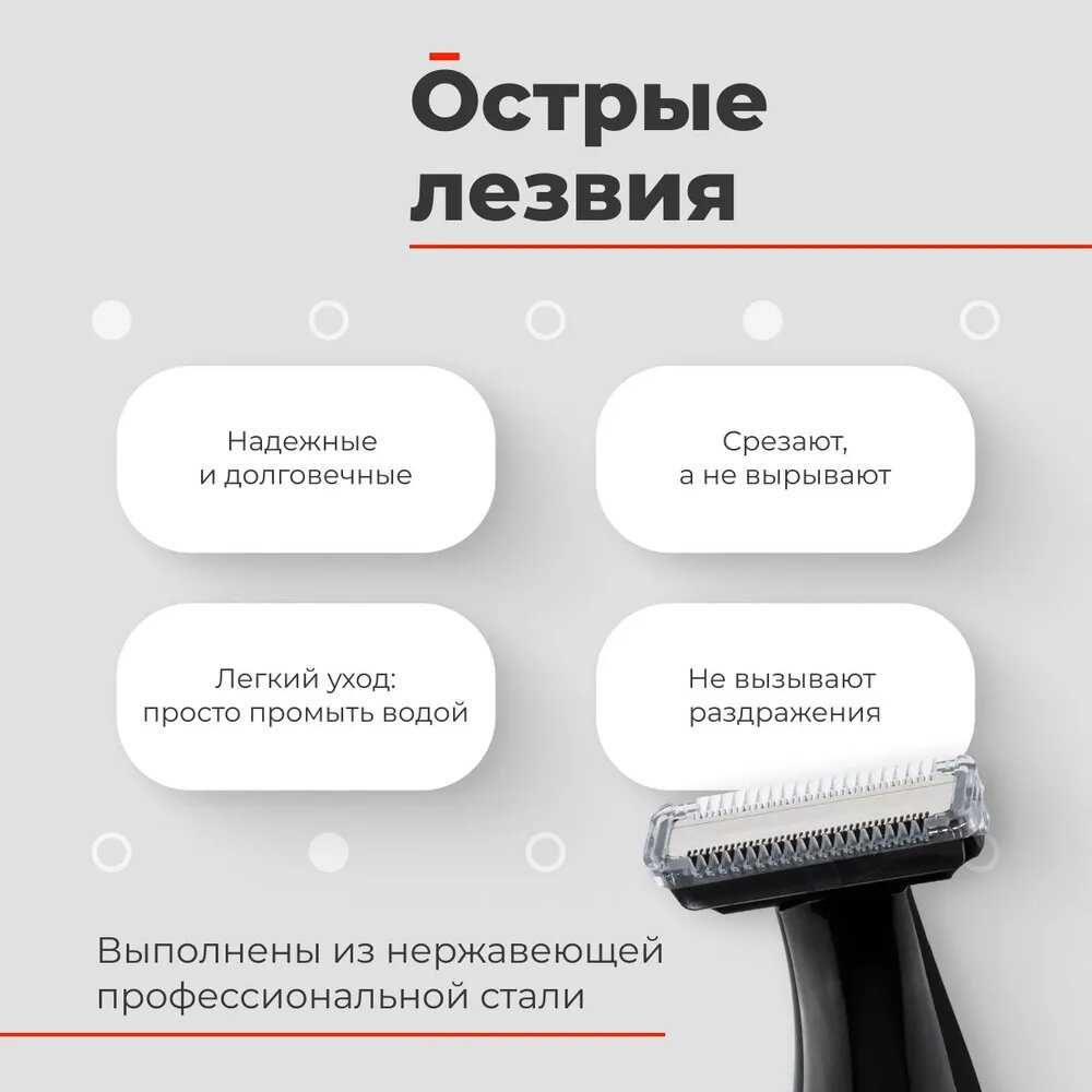 - Пользователи отмечают качественное сбривание волос на лице и теле без пропусков при использовании стандартных насадок.