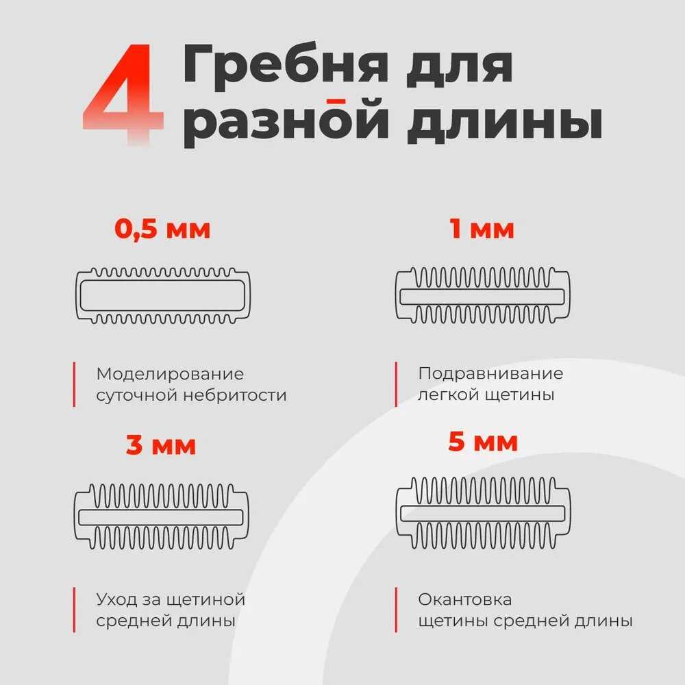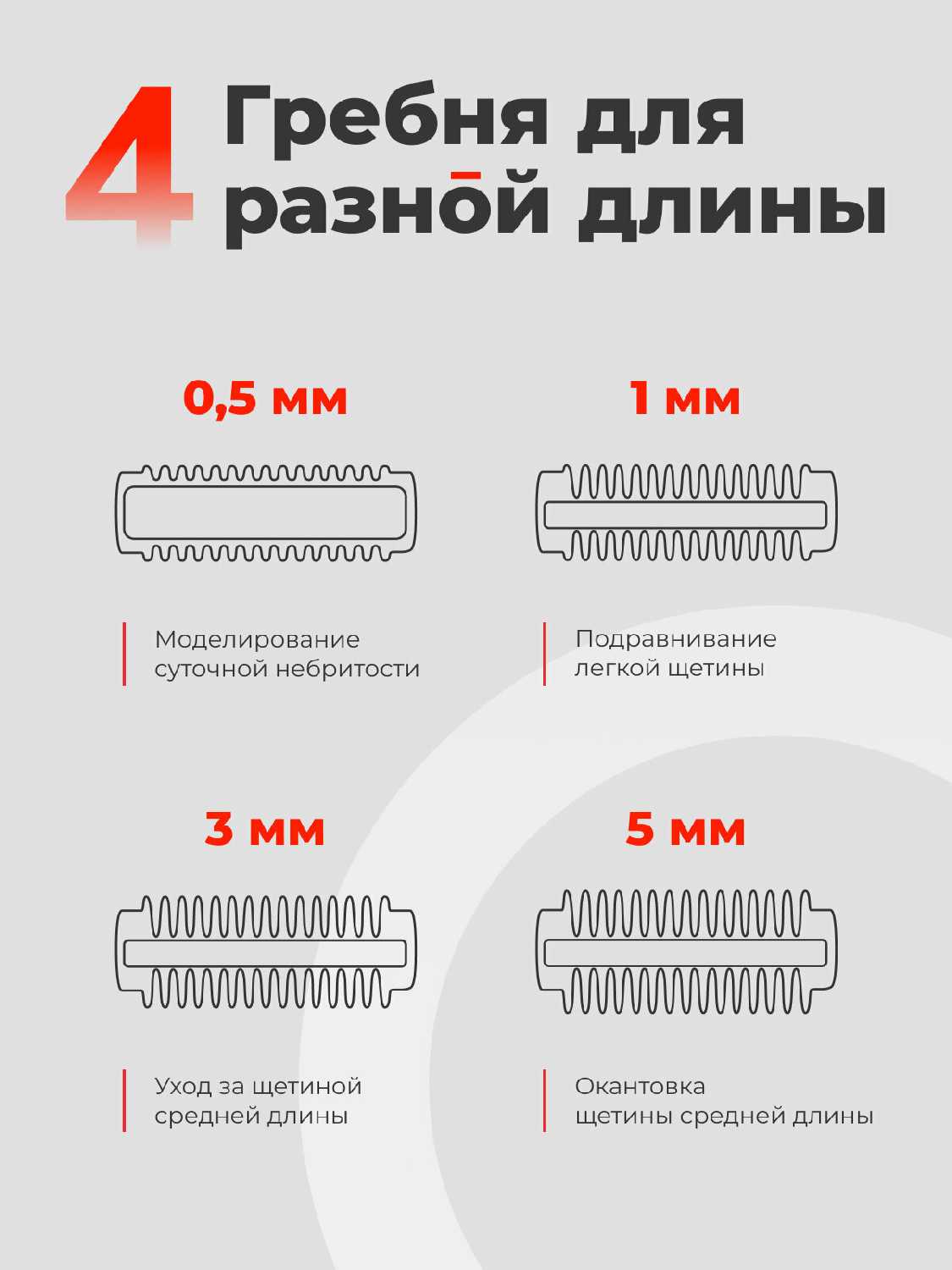 - Комплектные гребни (от 0.5 до 10 мм) позволяют создавать градиентную стрижку бороды.