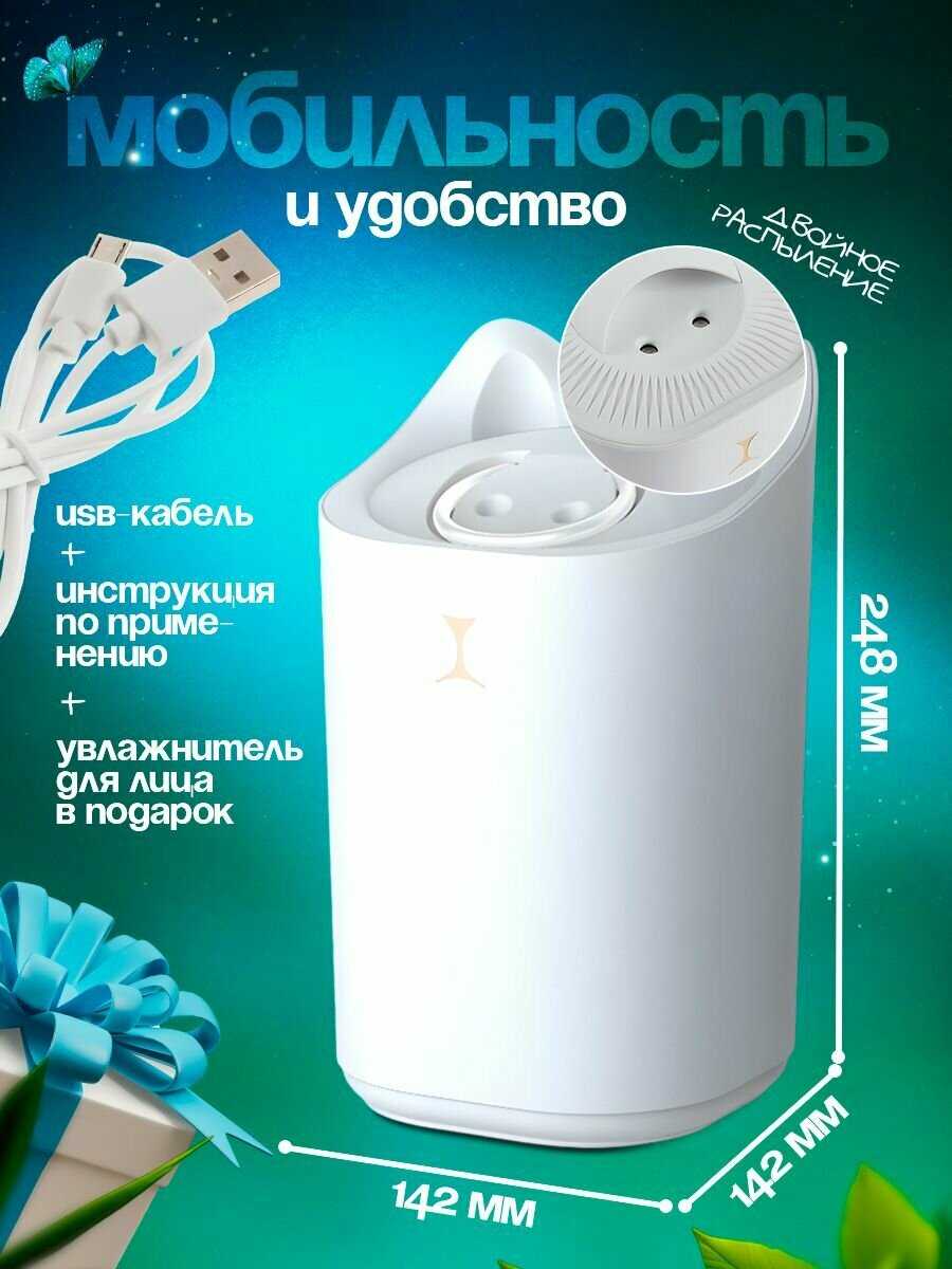 Простой дизайн. Большой. Мощная струя. Мало шума. Маленький увлажнитель милый. Удобный. Заряжается. Можно брать с собой. Хорошая струя. Есть подсветка. Нужно хорошо закручивать что бы не протекал.