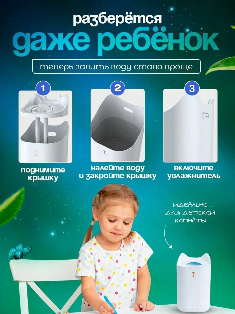 - + Классный увлажнитель, быстро увлажнил комнату в 40 кв.м. Переносим его в разные комнаты в доме. В детской остается на ночь, работает с ночником, детям нравится. Малыш маленький совсем, если плохо спит, я рядом ставлю увлажнитель, ему дышать легче становится и спит лучше. Резервуар большой, часто доливать не надо воду.