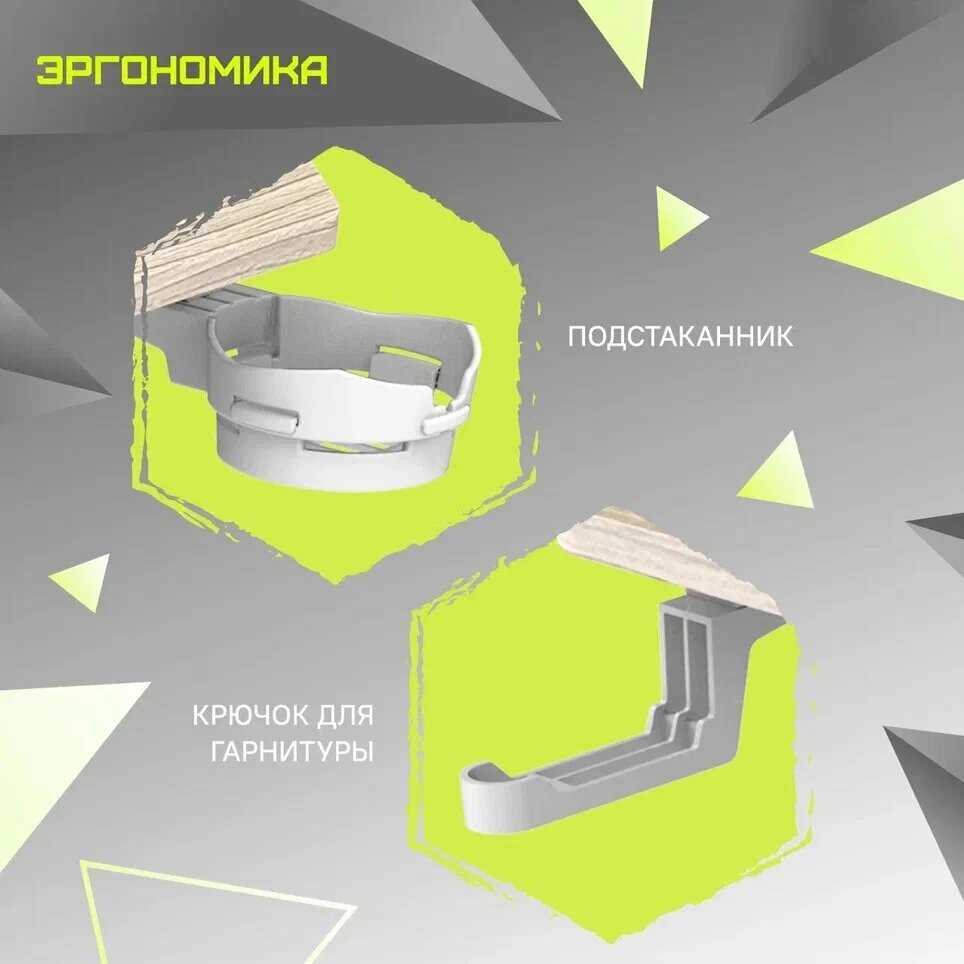 - + Отличный стол! Удобный лоток для проводов и блоков питания мониторов. Складной лоток для бутылки/кружки с лёгкостью удерживает литровую ёмкость.