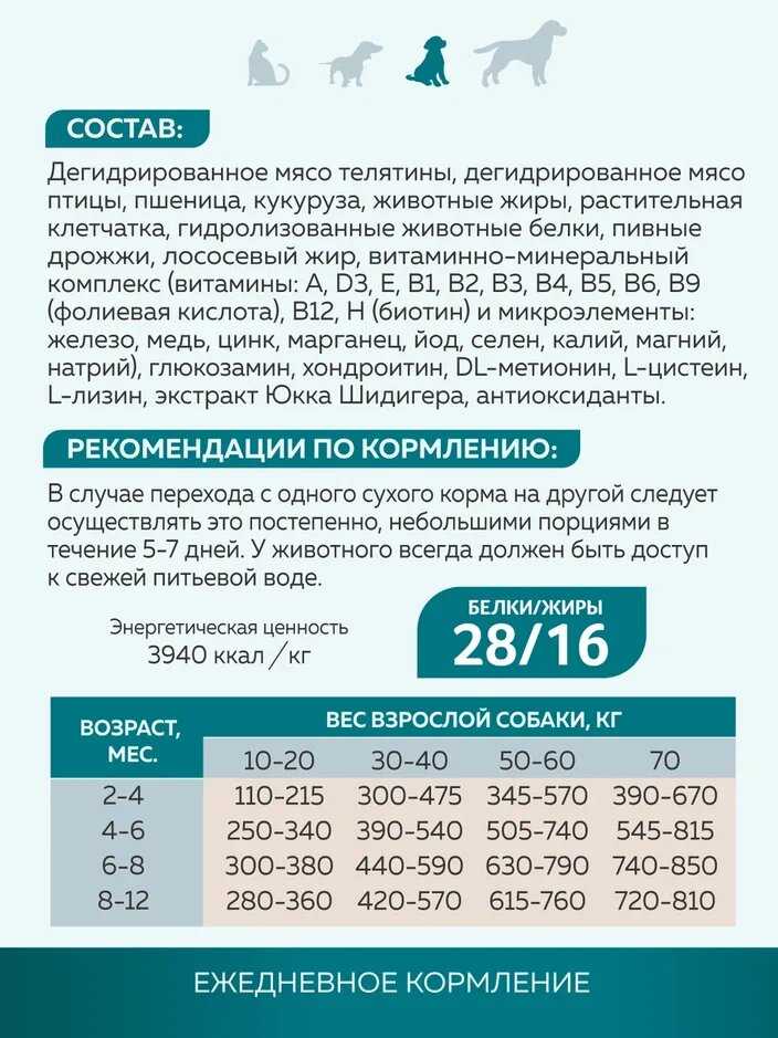 | Особые потребности : | для активных животных, для беременных/кормящих, для здоровья кожи и блеска шерсти, для здоровья костей и суставов, при чувствительном пищеварении |