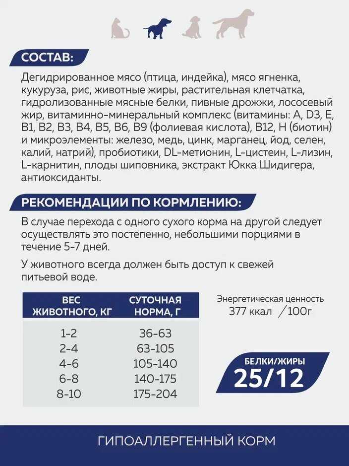 Сравнение с аналогами и целевая аудитория: Корм позиционируется как достойная альтернатива премиальным брендам, таким как Grandorf и Hill's, которые значительно выросли в цене или стали менее доступны, при этом демонстрируя сопоставимую эффективность в решении проблем аллергии и пищеварения. Основное преимущество перед конкурентами заключается в сочетании гипоаллергенного состава без курицы и относительно доступной стоимости, что делает его привлекательным для широкого круга владельцев, вынужденных искать замену более дорогим аналогам. Идеально подходит для собак с диагностированной пищевой аллергией, чувствительным пищеварением, а также для животных, переведенных с натурального питания или кормления отходами со стола, так как обеспечивает плавный и беспроблемный переход без расстройств ЖКТ. Рекомендован для пород, склонных к аллергическим реакциям и проблемам с кожей и шерстью, таких как бульдоги, лабрадоры, retrievers, доги и белые породы собак, а также для пожилых животных, требующих легкоусвояемого и питательного рациона. Опыт владельцев показывает, что корм хорошо воспринимается как чистокровными породистыми собаками, так и метисами, что подчеркивает его универсальность и сбалансированность для разных типов обмена веществ. Успешное применение у собак, проходящих реабилитацию после заболеваний или укусов клещей, на щадящем рационе, подтверждает его безопасность и способность поддерживать здоровье в сложные периоды.