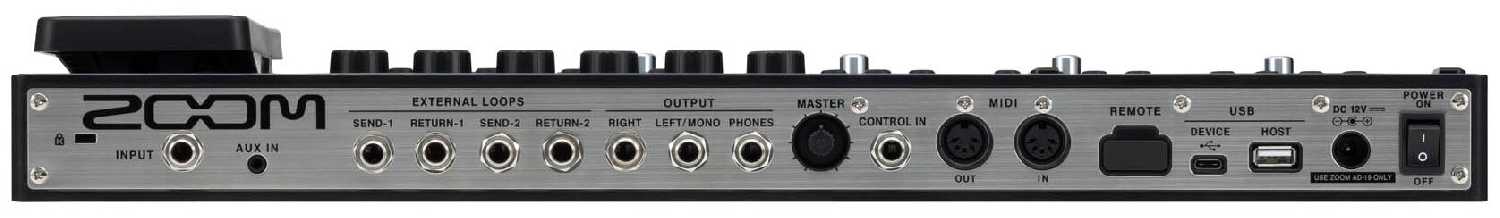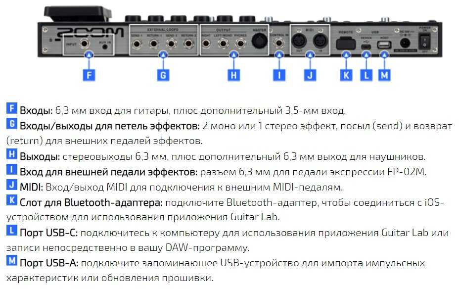 усилитель + 9 эффектов, 240 пользовательских патчей, частота дискретизации – 441 кГц, A/D преобразование: 24 бит 128-кратный оверсемплинг, D/A преобразование: 24 бит 128-кратный оверсемплинг, обработка сигнала: 32 бит, частотные характеристики: 20 Гц – 20 кГц +1 дБ -1 дБ (при нагрузке 10 кОм), цветной 5-дюймовый TFT-дисплей (800x480), матричные индикаторы (128x32) 6 шт., входы: – INPUT: стандартный монофонический джек номинальный входной уровень: -20 dBu входное сопротивление (Line): 500 кОм, – RETURN: стандартный монофонический джек (2 шт.), номинальный входной уровень: -20 dBu входное сопротивление (Line): 1 Мом, – AUX IN: стерео мини-джек номинальный входной уровень: -10 dBu входное сопротивление (Line): 10 кОм, выходы: – Left/Right: стандартный монофонический джек максимальный выходной уровень: INST/LINE +114 dBu/+19 dBu (при выходном сопротивлении 10 кОм или выше), – PHONES: стандартный стереофонический джек максимальный выходной уровень: Line +114 dBu (при выходном сопротивлении 10 кОм или выше) наушники 24 мВ + 24 мВ (32 Ом нагрузки), – SEND: стандартный монофонический джек (2 шт.) максимальный выходной уровень: Line +114 dBu (при выходном сопротивлении 10 кОм или выше), соотношение сигнал/шум: 123Дб, шумовой порог (остаточный шум): Left/Right : INST/LINE −995 dBu/−92.5 dBu SEND: -990 dBu, MIDI IN/OUT: разъемы 5-pin DIN, вход для педали: разъем для подключения ZOOM FP02, питание: адаптер питания DC 12В (плюс в центре) 2000 мА (Zoom AD-19), USB DEVICE: порт: USB 2.0 Type-C / Поддерживаемый кабель: Type-C cable, GuitarLab: USB1.1 Full Speed, режим аудиоинтерфейса: USB 2.0 High Speed 441 кГц/32-бит (4 входа/4 выхода). Только для передачи данных по USB. Питание от USB не поддерживается, USB HOST: порт: USB2.0 Type-A / стандарт: USB 2.0 High Speed, дистанционное управление: ZOOM BTA-1 или другой беспроводной адаптер. |