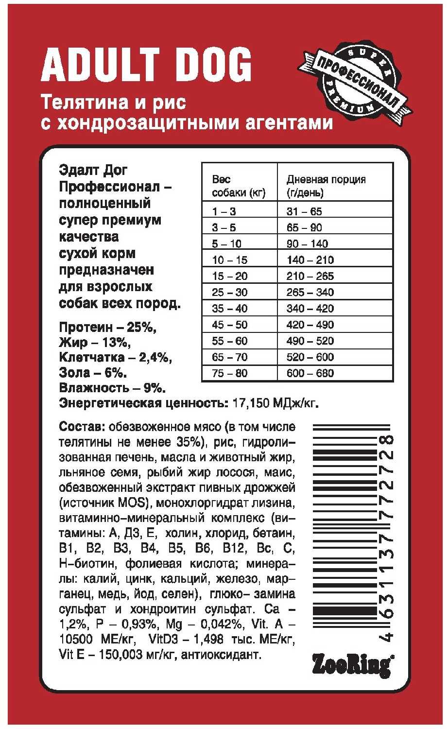 2. Сбалансированный состав: Основные ингредиенты — телятина и рис — хорошо усваиваются, подходят для собак с чувствительным пищеварением. Высокое содержание белка (25%) обеспечивает энергией активных животных.