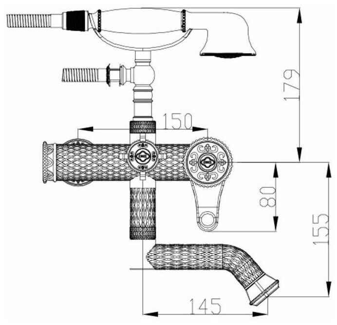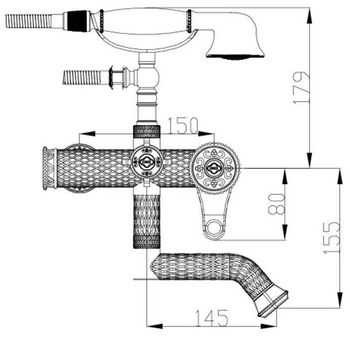 | Комплектация : | держатель лейки, излив для набора воды, лейка, ручной душ, смеситель, шланг |