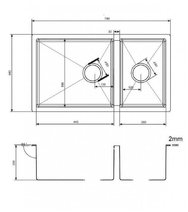 - + Толстый металл. Дно обработано шумопоглощающим покрытием. Достойная глубина (специально искал глубокую). Есть аварийный слив в основной чаше.