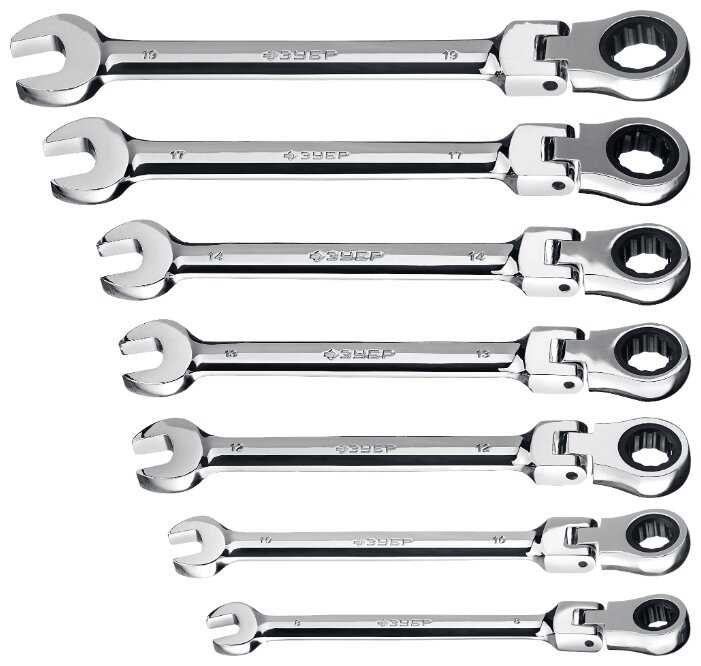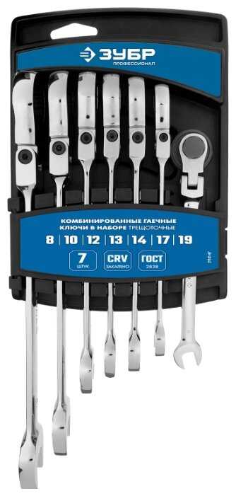 | Дополнительная информация : | набор шарнирных трещоточных гаечных ключей зубр профессионал 7 шт 8–19 мм (27101-H7), модель — 27101-H7, материал — CrV сталь, покрытие — хромированное, упаковка — пластиковая подвеска, стандарт — ГОСТ2838, профессиональный инструмент, выдерживает высокие нагрузки, стойкий к истиранию рабочих граней, с шарнирным механизмом, с трещоточным механизмом, гарантия — 6". |