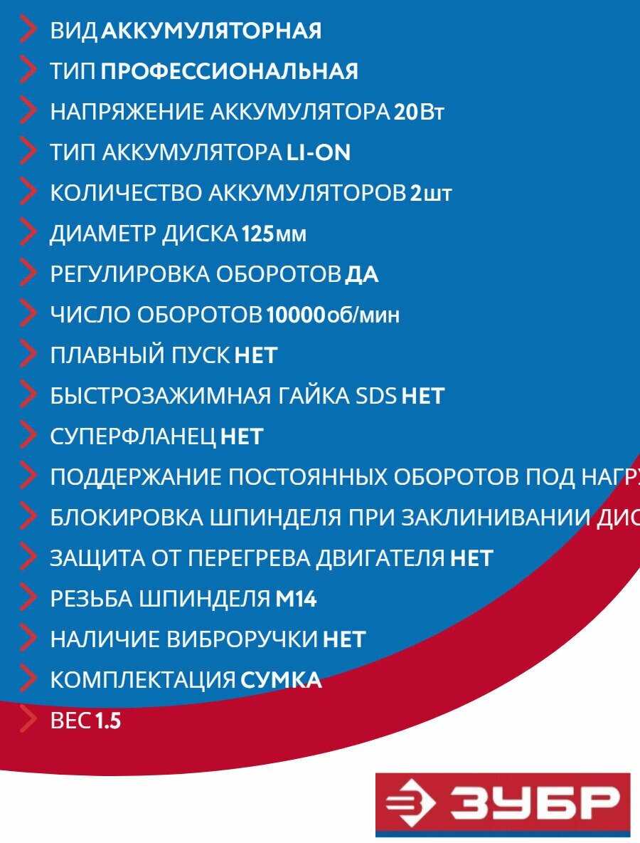 ![Аккумуляторная УШМ ЗУБР AB-125-42 [125 мм] фотография 9](/images/item/51/a3/akkumulyatornaya_ushm_zubr_ab_125_42_125_mm-4720344pic9.jpg)