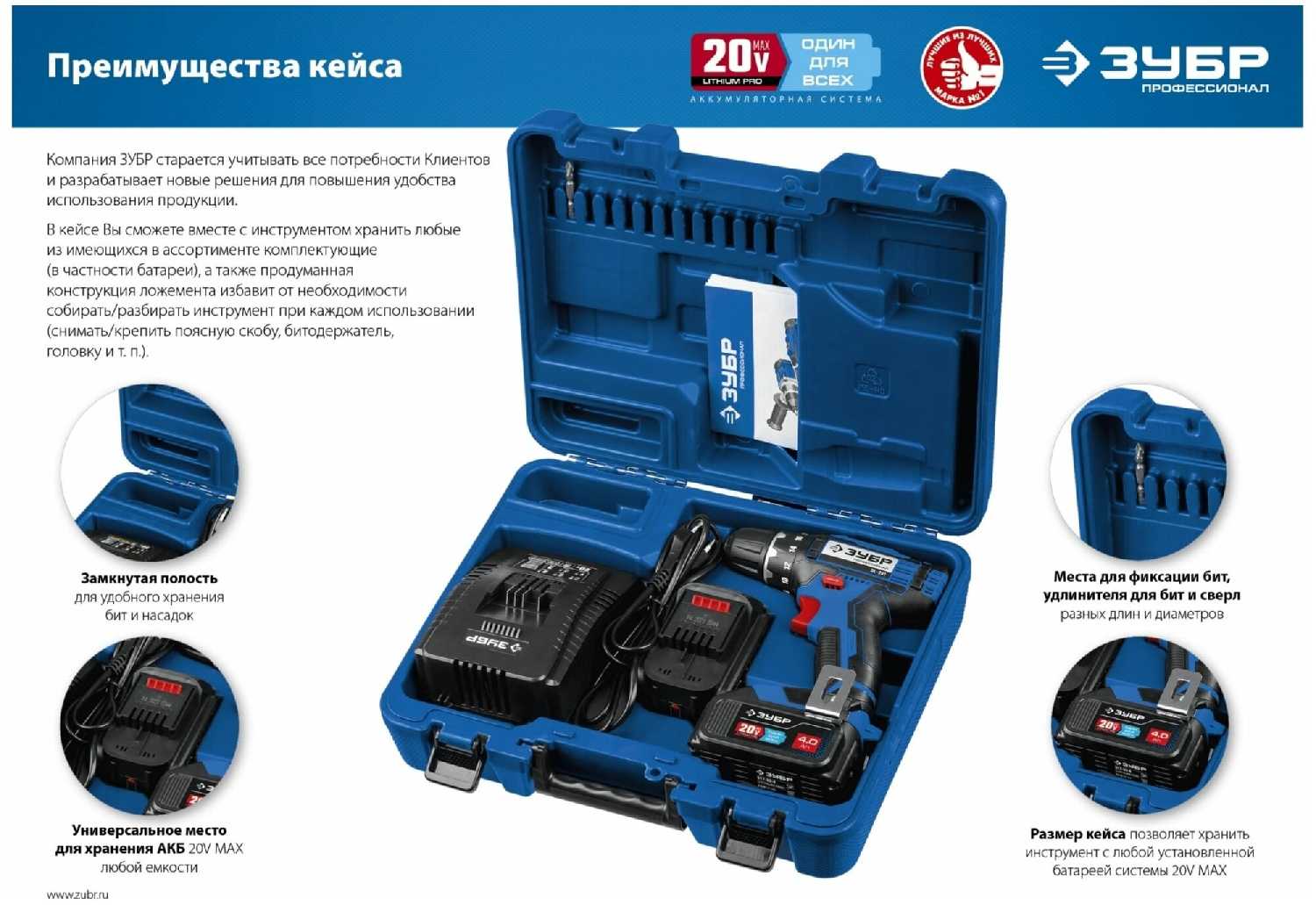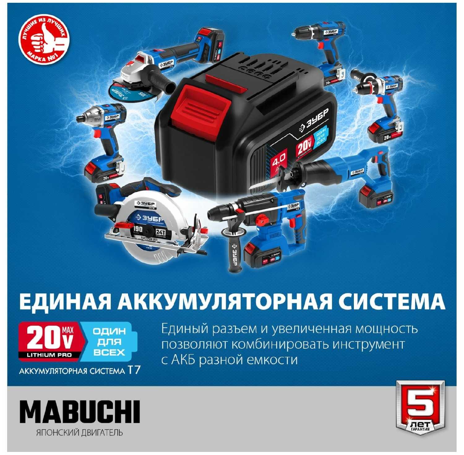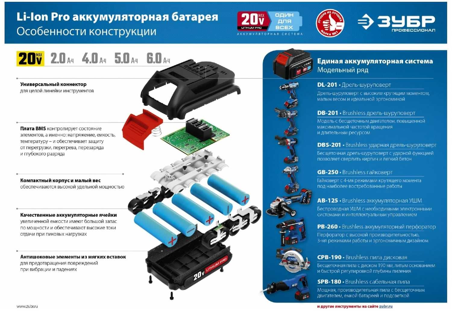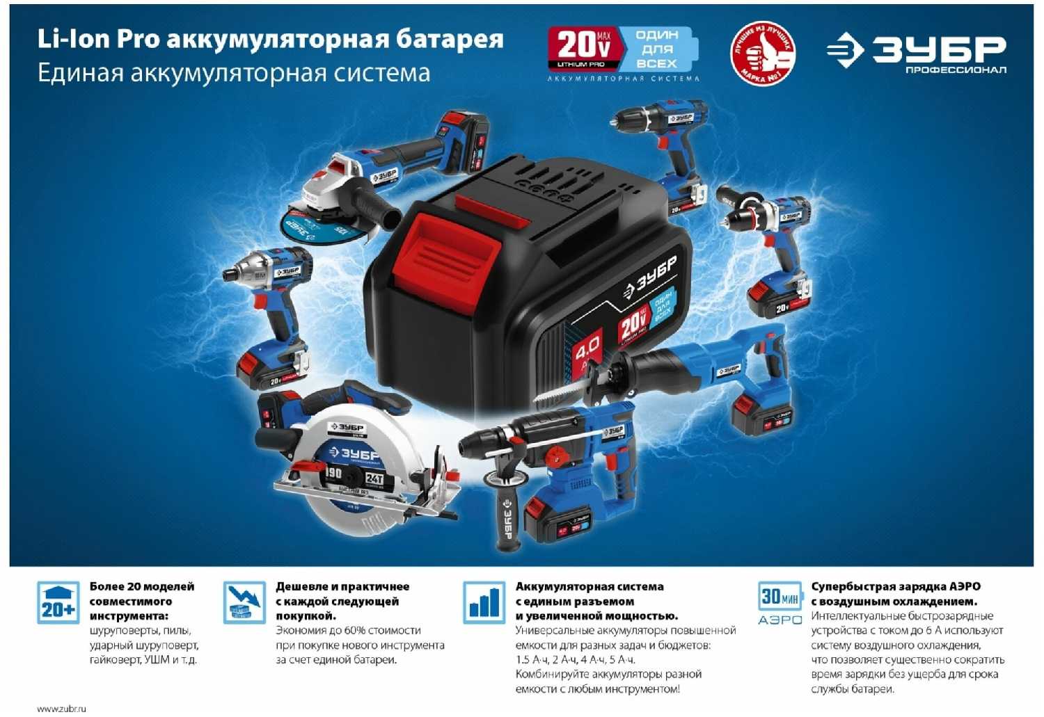 - аккумуляторная система: ЗУБР 20V MAX Lithium PRO
