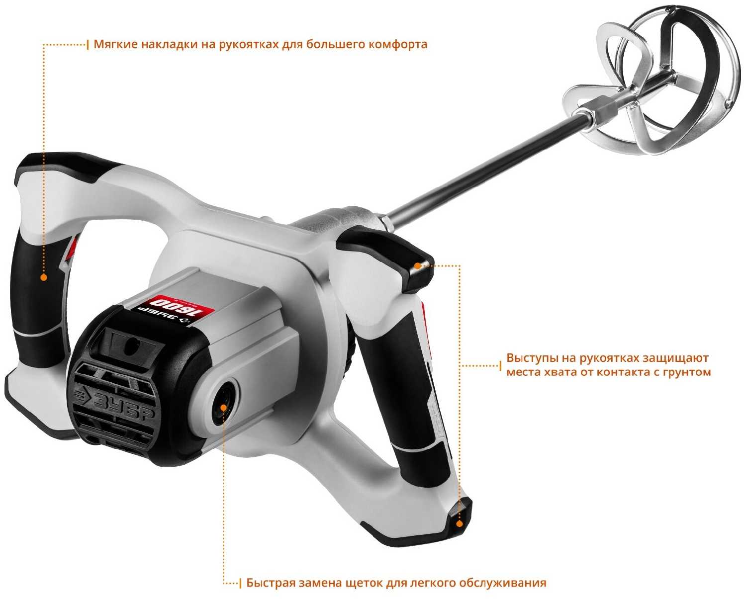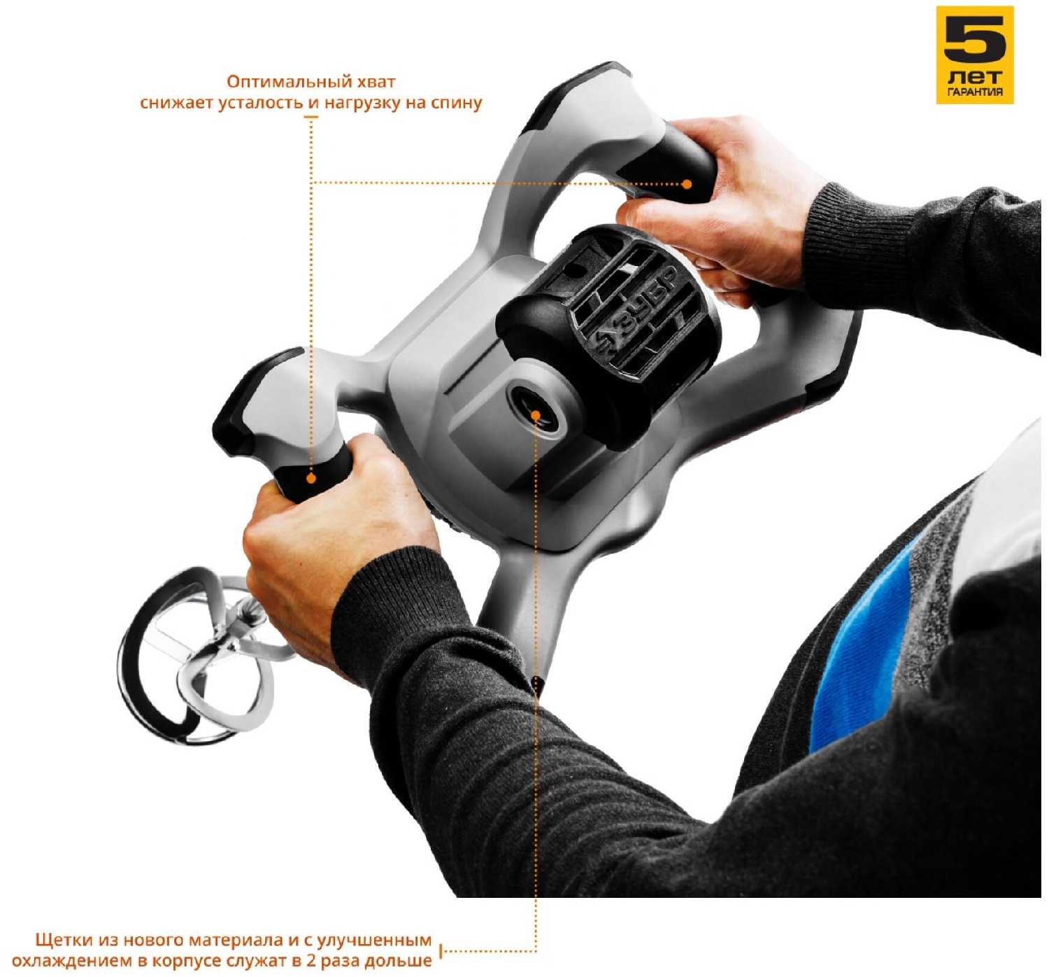 - Резиновые накладки на рукоятях предотвращают проскальзывание даже при замесе в 70-литровых ёмкостях.