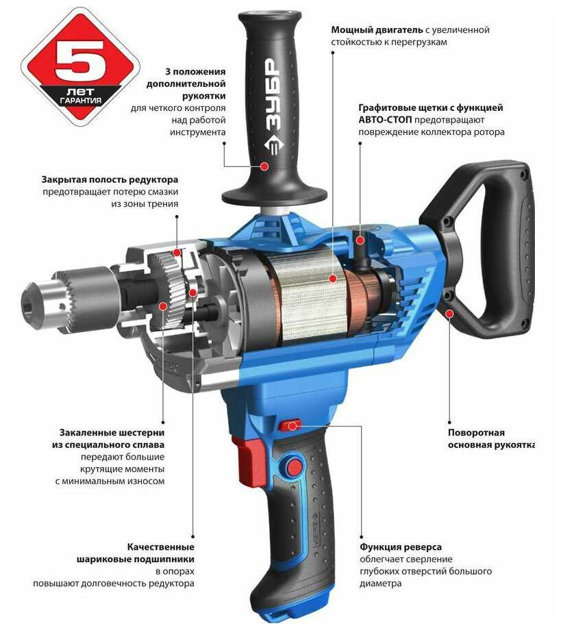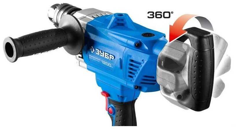 С удовольствием пользуюсь этой дрелью миксером. Очень мощная и безотказная. Корпус изготовлен из качественных, что оставляет приятное впечатление. Дополнительную рукоятку можно устанавливать в трех положениях. Основная рукоятка поворотная. Присутствует функция реверса. На даче просто незаменимая вещь. Всем рекомендую!