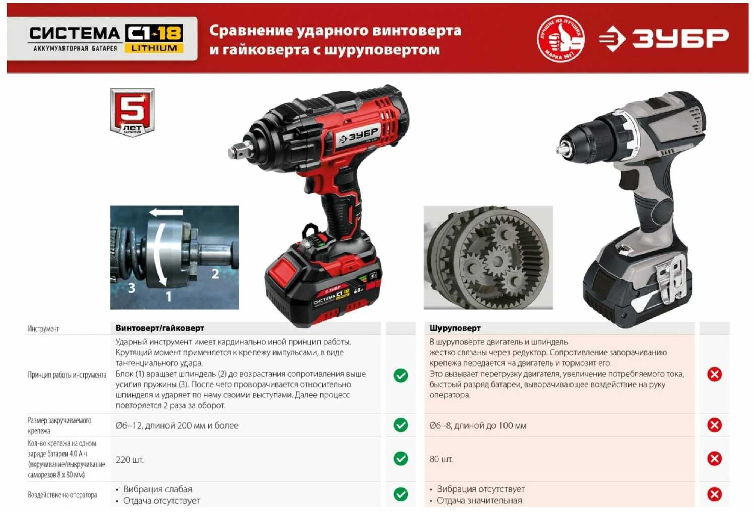 общался с представителем зубра.он ответил техника надежная если аккумулятор свежий.так как зубр еще не такой популярный гайковерт они лежат на складах.потом в магазинах.а литий соотвественно боиться глубокого разряда.соотвественно от времени акуммулятор приходит в негодность еще не зксплуатироваясь.но если купить его сразу после завода он служит превосходно