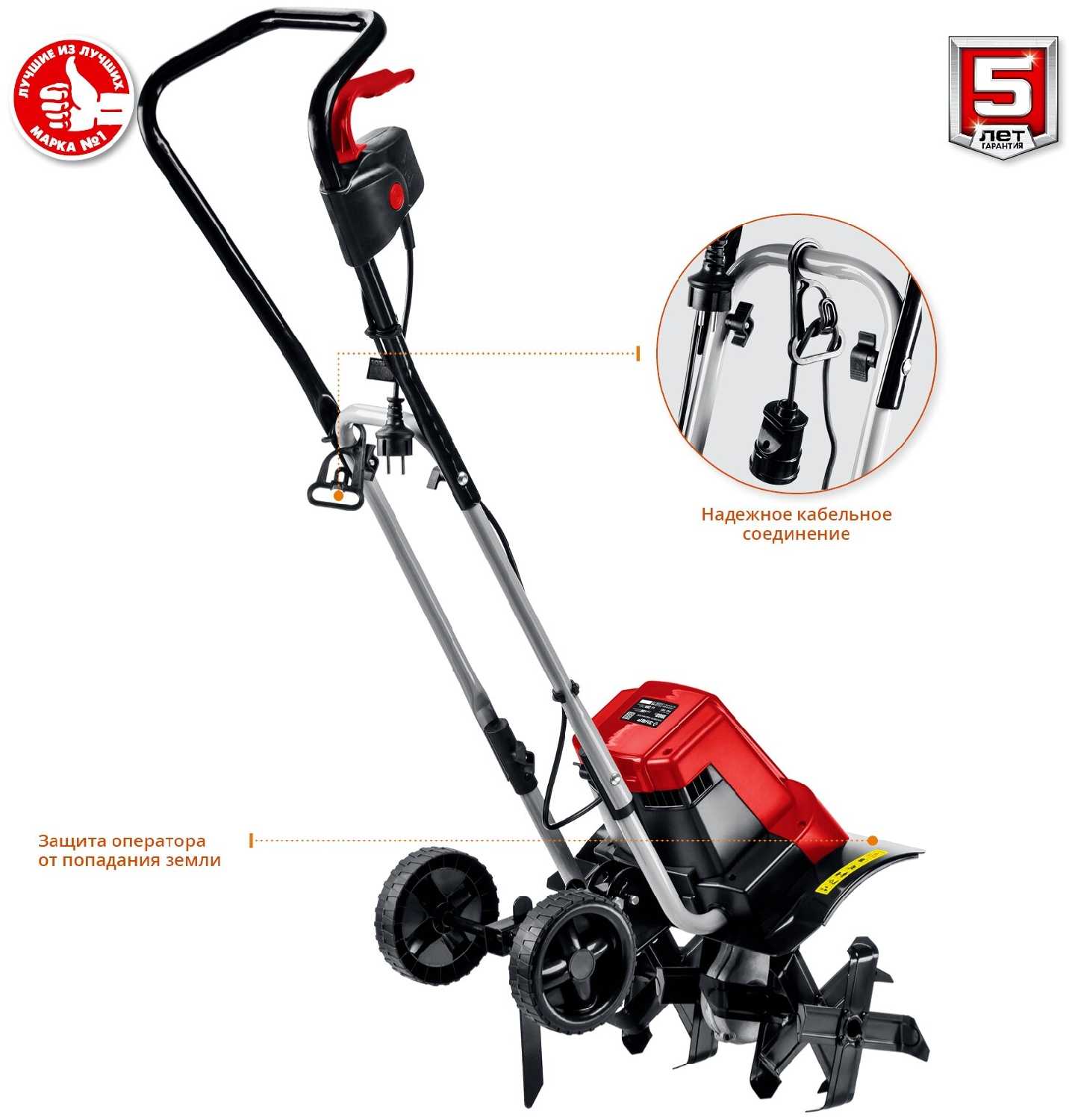 Удобство и эргономика:Лёгкий вес (от 10 кг) — главное преимущество для женщин и пожилых пользователей. Многие отмечают, что справиться может даже ребёнок 12 лет. Однако малая масса становится недостатком на твёрдой почве: агрегат «выпрыгивает», разбрасывает землю в стороны, включая оператора. Для устойчивости приходится нажимать на рукоятки всем весом. Транспортировочные колёса из литого пластика критикуют за неустойчивость, но они удобны для перемещения между грядками. Ручка включения расположена неудобно — кнопка блокировки далеко, а пластиковый рычаг хлипкий. Зато электрическая модель избавляет от проблем с бензином: нет выхлопов, шума (в сравнении с бензиновыми аналогами), а кабель при правильном расположении (сбоку или подвешен на проволоке) не мешает работе.