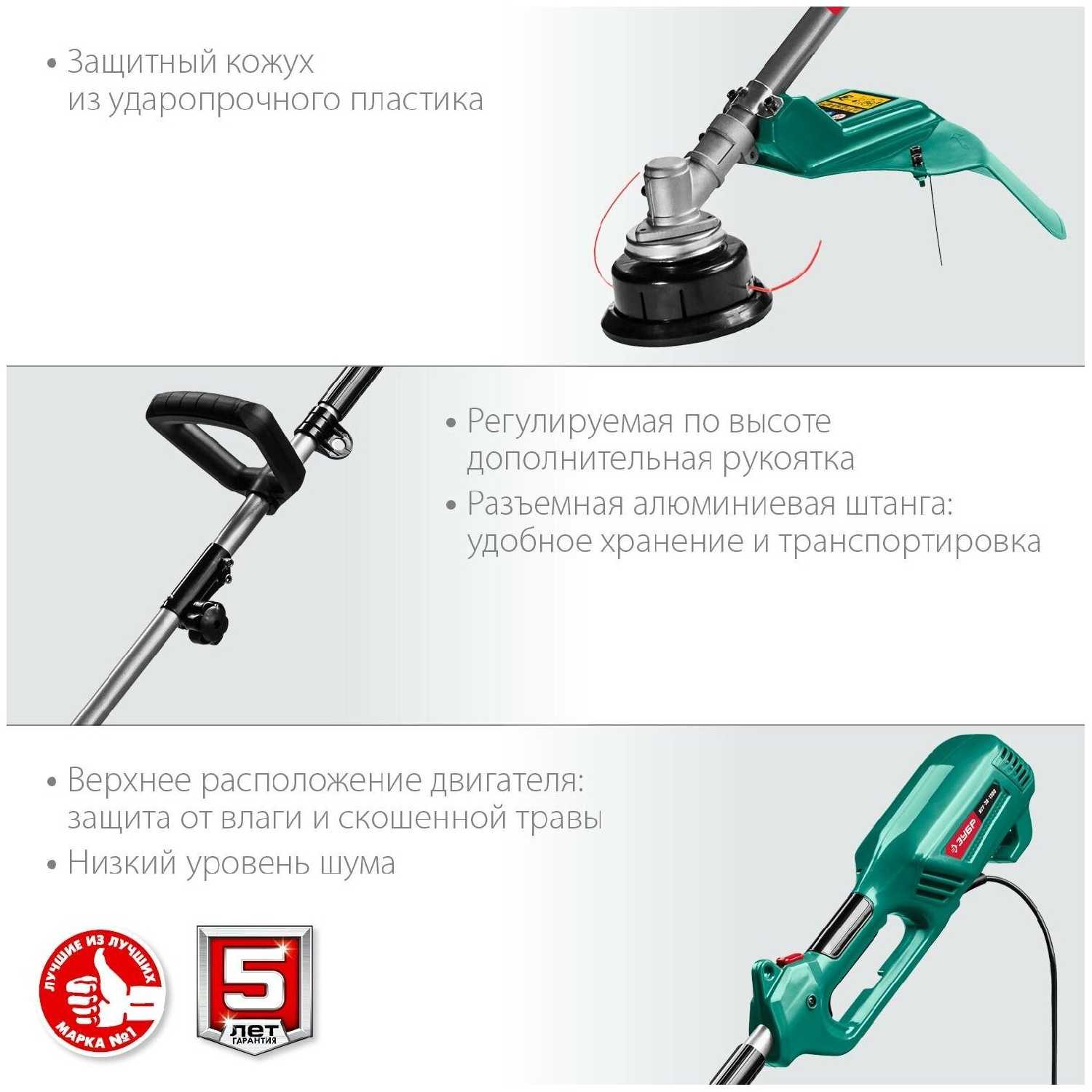 Приобрели эту косу, т.к. вышли из строя Gardena и Black and Decker. Плюс - то, что мощная, фрезу еще даже не опробовали, пока хватило лески. Минусы - очень сильная вибрация на руки, очень грубо исполнена по сравнению с теми косами, что у нас есть (кнопки, пластиковые детали). Например пластиковая трубка на ручке просто обломана по краю. Очень большая катушка с леской, не для женской руки, даже при длинных пальцах. Чтобы поставить и снять ее, надо прилагать большие усилия. Пластик грубый. Пружина из катушки потерялась в траве бесследно при первом же использовании, т.к. ничем не закреплена и каждый раз вываливается при перезаправке лески. Ремень на плечо слабоват для такой большой и тяжелой косы, его пришлось снять, чтобы не болтался. Если коса окажется надежной, то какое-то определенные функции она выполнять будет, видимо, не кошение газонной травы, а зарослей и сорняков. Порадовало на косе слово Japan на одной из деталей, может, в ней есть и что-то японское. Рискнули купить косу этой фирмы, т.к. уже есть садовый измельчитель Зубр. Но его исполнение более цивильно.