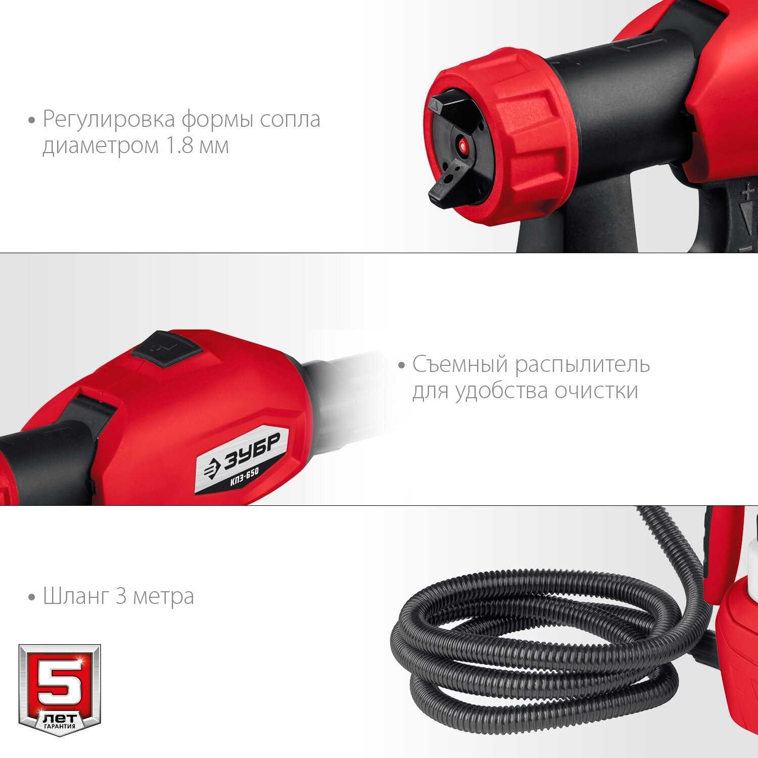 - Три режима распыления адаптируют струю под разные сценарии, от тонкого лака на террасе до густой эмали, снижая расход материала и время на 4 раза по сравнению с валиком.