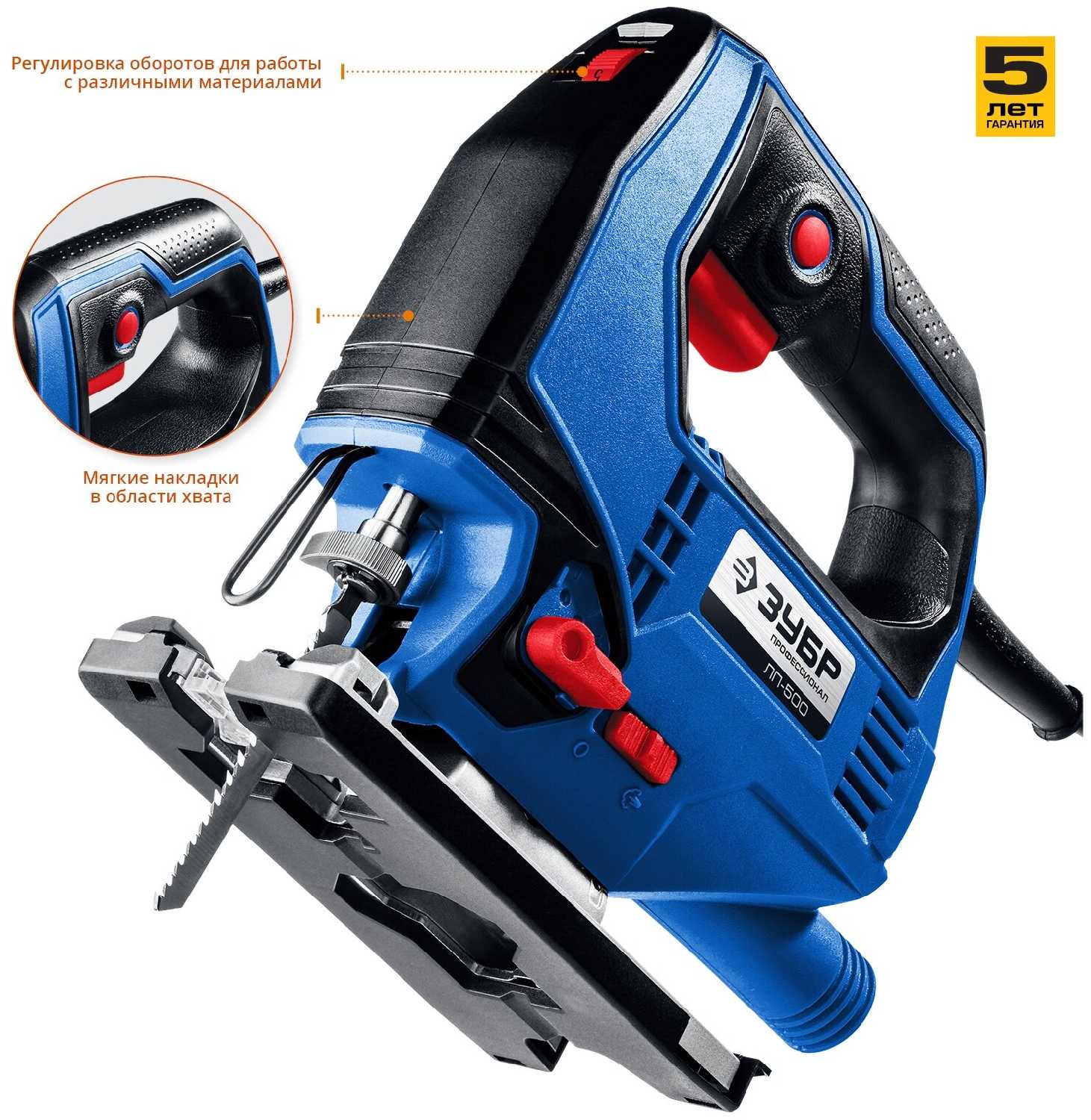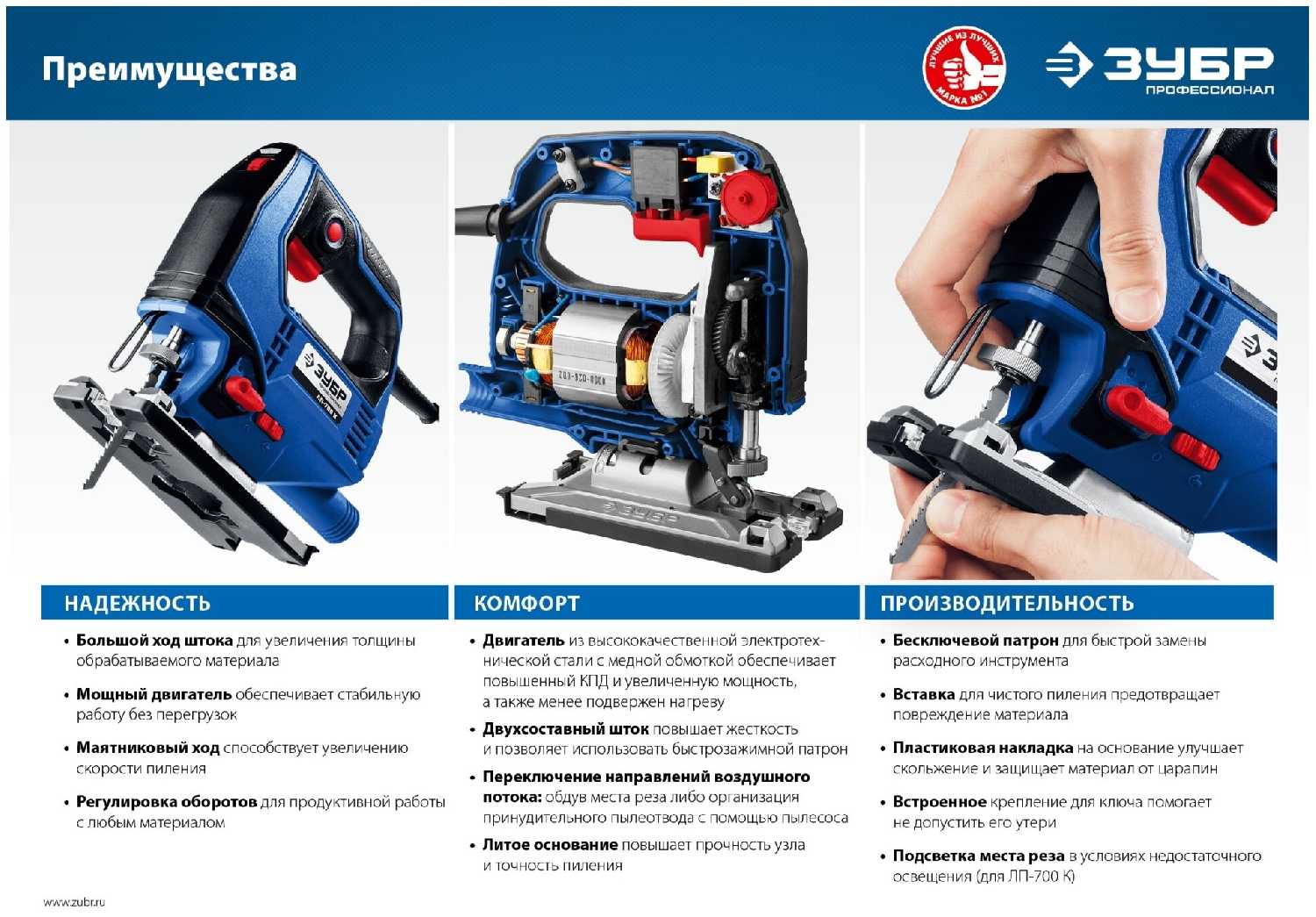 - + быстрый зажим пилки, длинный кабель, регулировка оборотов и маятниковый ход