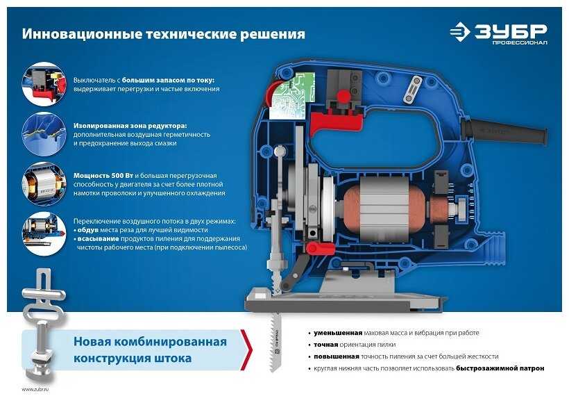 | Особенности конструкции : | антивибрационная система, быстрозажимное крепление пилки, возможность подключения пылесоса, защитный щиток, обрезиненная рукоятка, отсек для хранения пилок, подсветка, регулировка наклона подошвы без инструмента, сдув опилок |