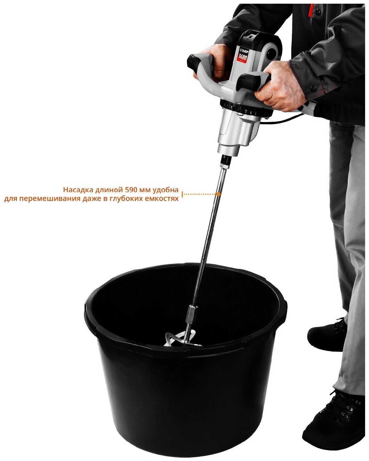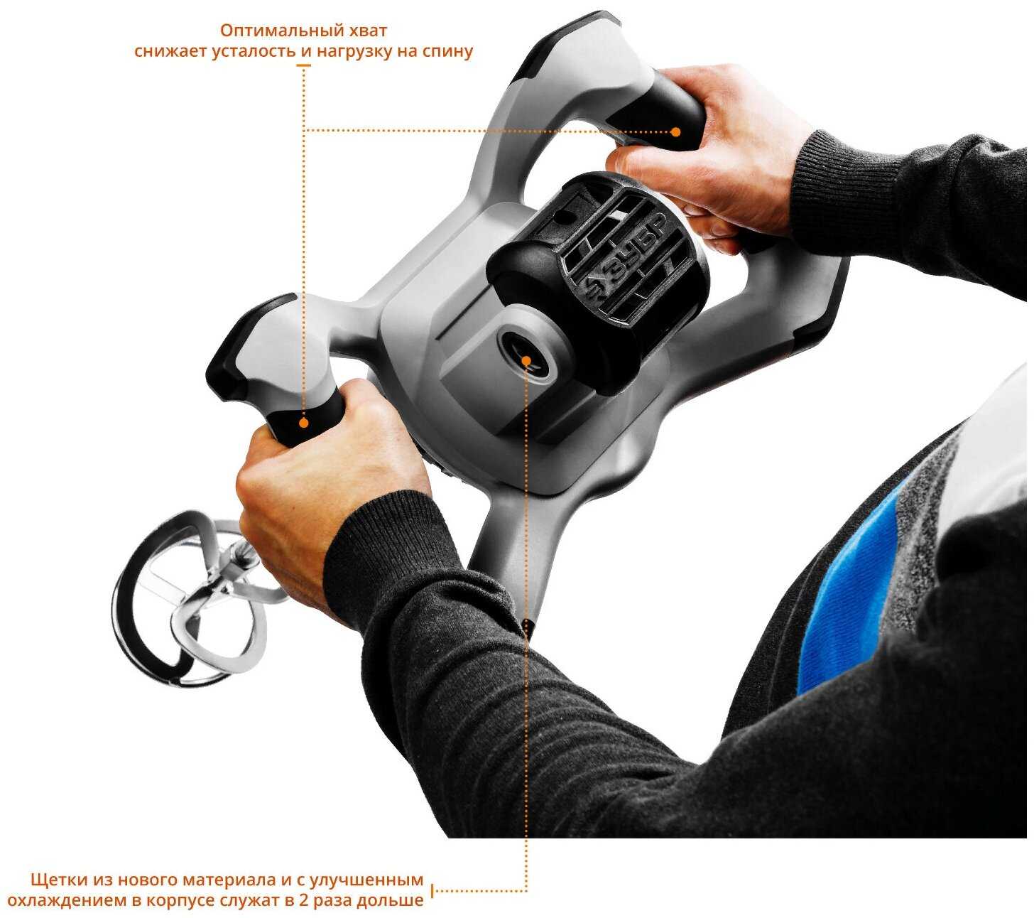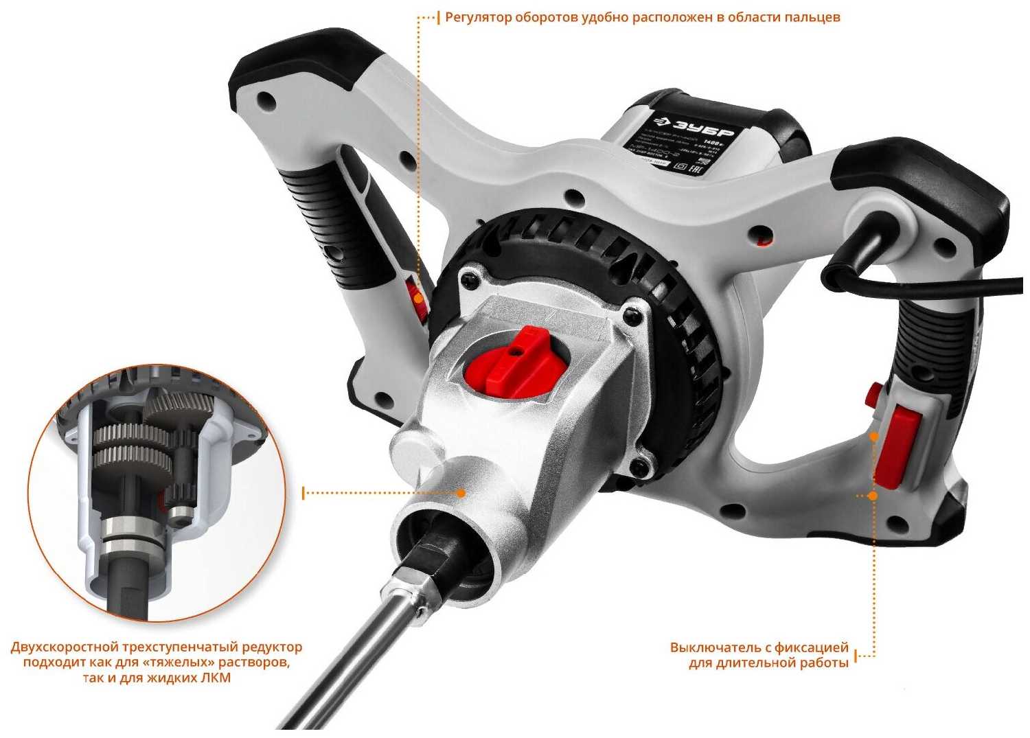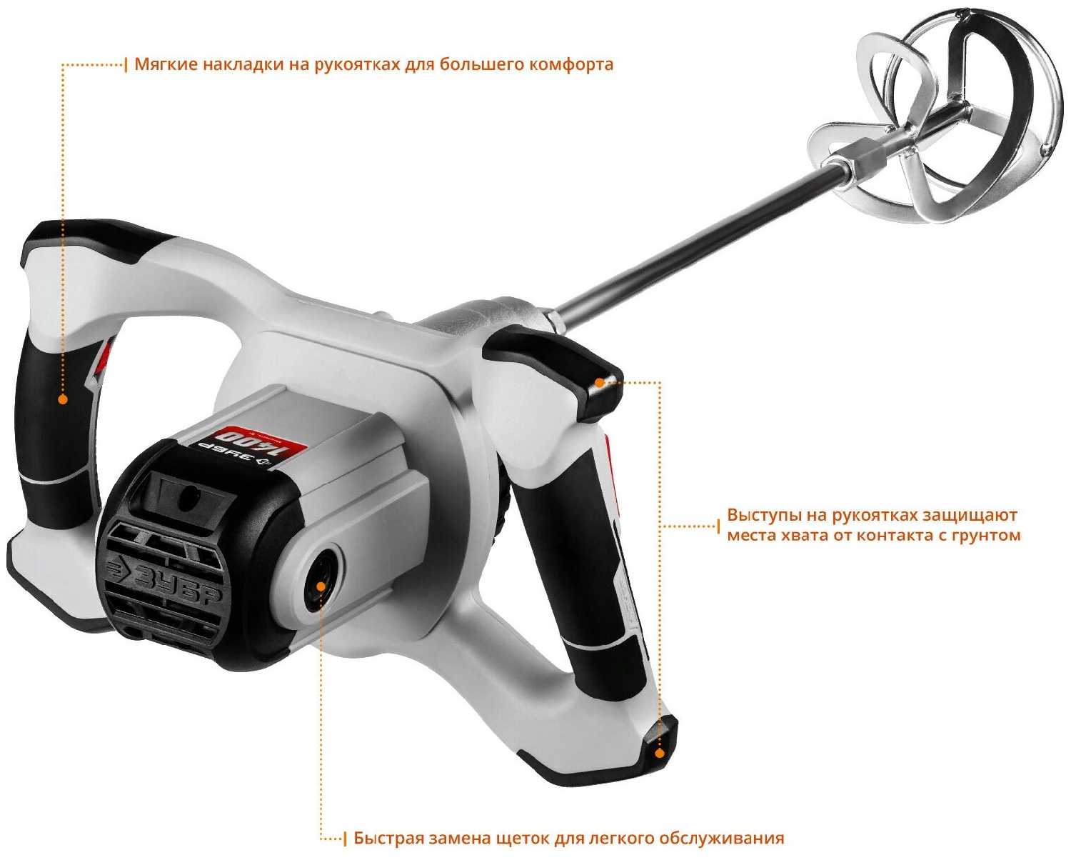 Дополнительная информация : | Преимущества ЗУБР МАСТЕР МР-1400-2 Быстрый доступ к щеткам для удобства замены Патрон М14 для установки наиболее распространенного типа насадок Выход кабеля в сторону исключает попадание его в рабочую область Рукоятки с противоскользящими покрытием для надежного хвата ЗУБР МР-1400-2 Выступающие углы рукоятки защищают места хвата от контакта с грязью при опоре на грунт Высокий крутящий момент для густых растворов или быстрое перемешивание жидких ЛКМ благодаря двухскоростному редуктору Кнопка блокировки выключателя предохраняет от непреднамеренного пуска Большая ширина и специальный профиль лопастей венчика для эффективного перемешивания Электронная регулировка числа оборотов позволяет начать перемешивание на минимальных оборотах и настраивать частоту вращения прямо в процессе работы Металлический корпус редуктора обеспечивает бОльшую прочность и лучшее охлаждение Насадка сборной конструкции позволяет уменьшить габариты упаковки |